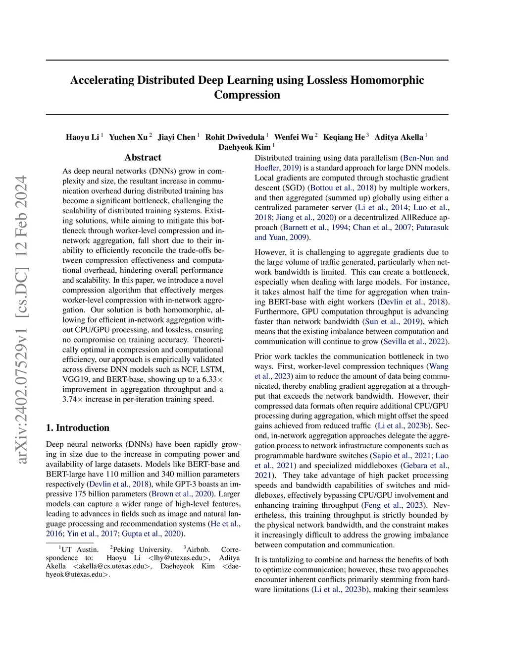 Accelerating Distributed Deep Learning using Lossless Homomorphic