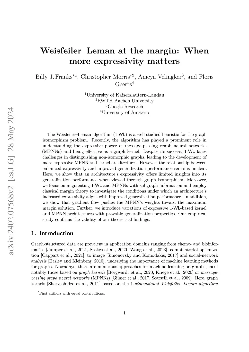 The Weisfeiler-Leman algorithm (-WL) is a well-studied heuristic for the graph isomorphism problem. Recently, the algorithm has played a prominent role in understanding the expressive power of message-passing graph neural networks (MPNNs) and being effective as a graph kernel. Despite its success, -WL faces challenges in distinguishing non-isomorphic graphs, leading to the development of more expressive MPNN and kernel architectures. However, the relationship between enhanced expressivity and improved generalization performance remains unclear. Here, we show that an architecture's expressivity offers limited insights into its generalization performance when viewed through graph isomorphism. Moreover, we focus on augmenting -WL and MPNNs with subgraph information and employ classical margin theory to investigate the conditions under which an architecture's increased expressivity aligns with improved generalization performance. In addition, we show that gradient flow pushes the MPNN's weights toward the maximum margin solution. Further, we introduce variations of expressive -WL-based kernel and MPNN architectures with provable generalization properties. Our empirical study confirms the validity of our theoretical findings.