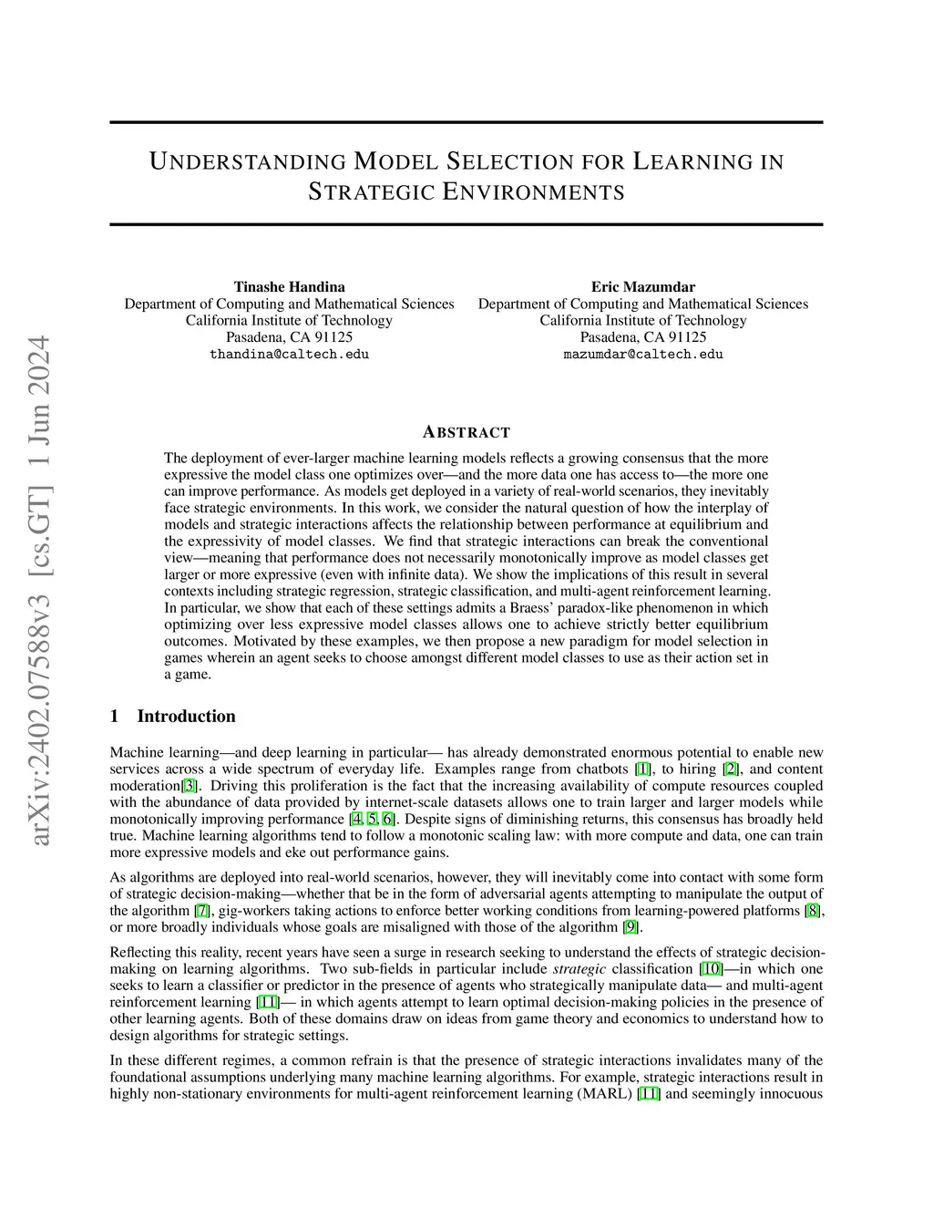 The deployment of ever-larger machine learning models reflects a growing consensus that the more expressive the model class one optimizes overand the more data one has access tothe more one can improve performance. As models get deployed in a variety of real-world scenarios, they inevitably face strategic environments. In this work, we consider the natural question of how the interplay of models and strategic interactions affects the relationship between performance at equilibrium and the expressivity of model classes. We find that strategic interactions can break the conventional viewmeaning that performance does not necessarily monotonically improve as model classes get larger or more expressive (even with infinite data). We show the implications of this result in several contexts including strategic regression, strategic classification, and multi-agent reinforcement learning. In particular, we show that each of these settings admits a Braess' paradox-like phenomenon in which optimizing over less expressive model classes allows one to achieve strictly better equilibrium outcomes. Motivated by these examples, we then propose a new paradigm for model selection in games wherein an agent seeks to choose amongst different model classes to use as their action set in a game.