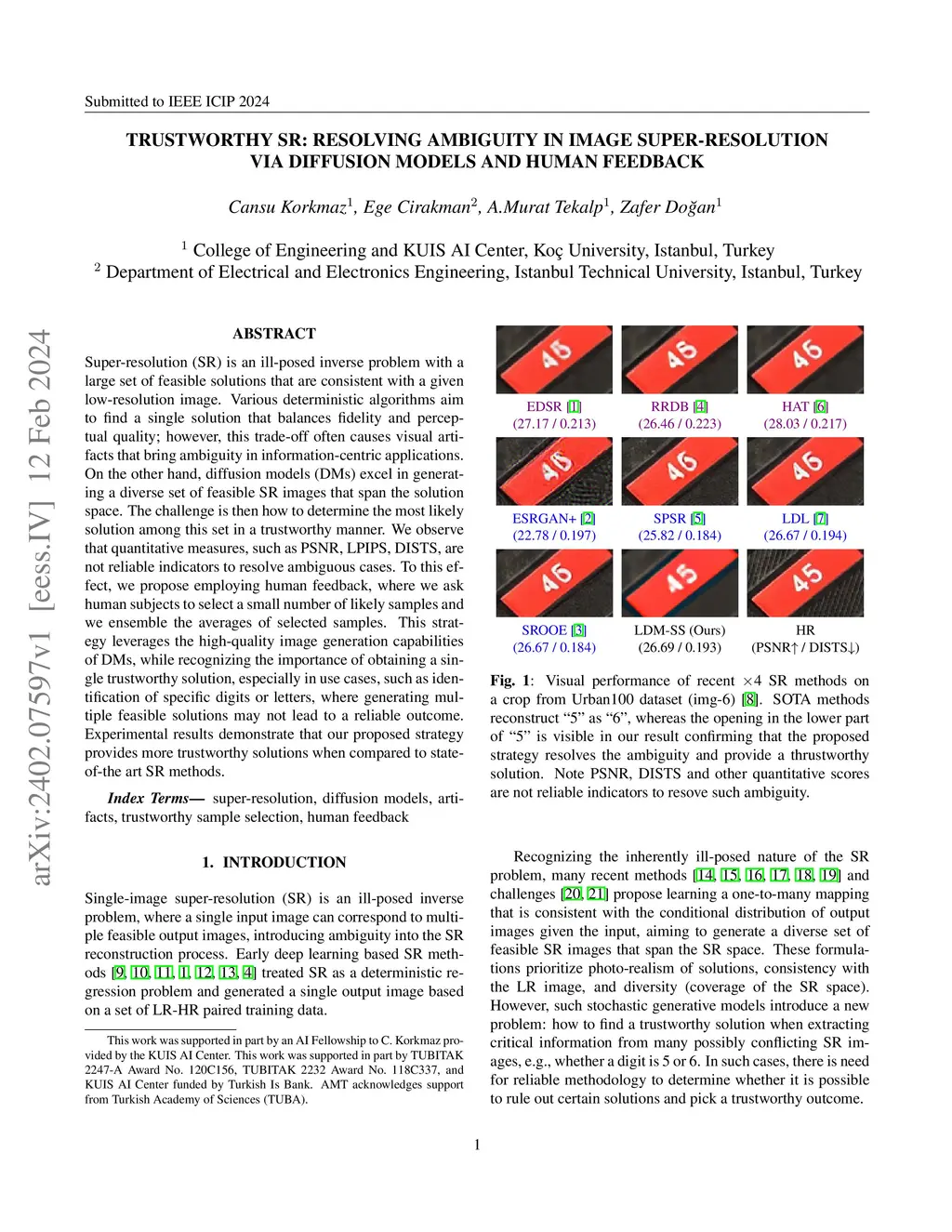 Super-resolution (SR) is an ill-posed inverse problem with a large set of feasible solutions that are consistent with a given low-resolution image. Various deterministic algorithms aim to find a single solution that balances fidelity and perceptual quality; however, this trade-off often causes visual artifacts that bring ambiguity in information-centric applications. On the other hand, diffusion models (DMs) excel in generating a diverse set of feasible SR images that span the solution space. The challenge is then how to determine the most likely solution among this set in a trustworthy manner. We observe that quantitative measures, such as PSNR, LPIPS, DISTS, are not reliable indicators to resolve ambiguous cases. To this effect, we propose employing human feedback, where we ask human subjects to select a small number of likely samples and we ensemble the averages of selected samples. This strategy leverages the high-quality image generation capabilities of DMs, while recognizing the importance of obtaining a single trustworthy solution, especially in use cases, such as identification of specific digits or letters, where generating multiple feasible solutions may not lead to a reliable outcome. Experimental results demonstrate that our proposed strategy provides more trustworthy solutions when compared to state-of-the art SR methods.