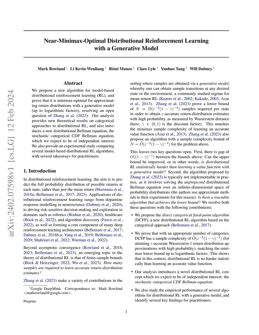 We propose a new algorithm for model-based distributional reinforcement learning (RL), and prove that it is minimax-optimal for approximating return distributions with a generative model (up to logarithmic factors), resolving an open question of Zhang et al. (2023). Our analysis provides new theoretical results on categorical approaches to distributional RL, and also introduces a new distributional Bellman equation, the stochastic categorical CDF Bellman equation, which we expect to be of independent interest. We also provide an experimental study comparing several model-based distributional RL algorithms, with several takeaways for practitioners.