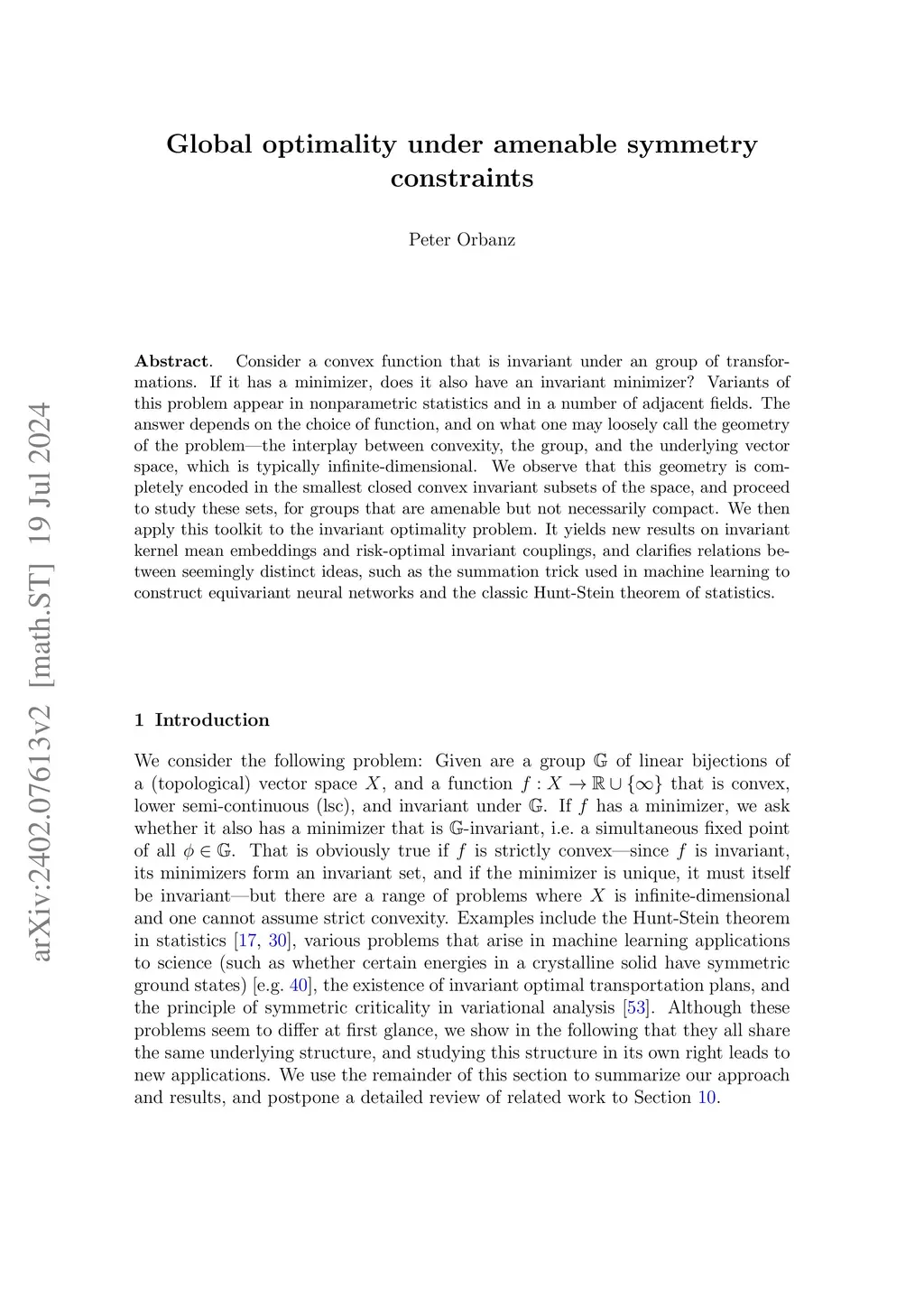 Consider a convex function that is invariant under an group of transformations. If it has a minimizer, does it also have an invariant minimizer? Variants of this problem appear in nonparametric statistics and in a number of adjacent fields. The answer depends on the choice of function, and on what one may loosely call the geometry of the problem -- the interplay between convexity, the group, and the underlying vector space, which is typically infinite-dimensional. We observe that this geometry is completely encoded in the smallest closed convex invariant subsets of the space, and proceed to study these sets, for groups that are amenable but not necessarily compact. We then apply this toolkit to the invariant optimality problem. It yields new results on invariant kernel mean embeddings and risk-optimal invariant couplings, and clarifies relations between seemingly distinct ideas, such as the summation trick used in machine learning to construct equivariant neural networks and the classic Hunt-Stein theorem of statistics.
