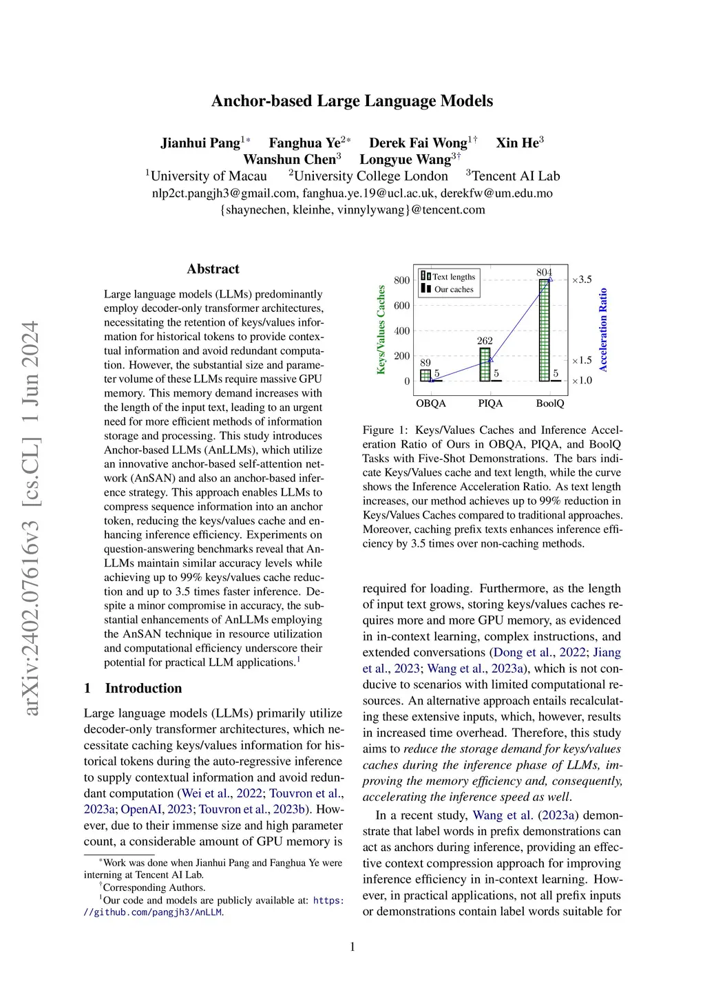 Large language models (LLMs) predominantly employ decoder-only transformer architectures, necessitating the retention of keys/values information for historical tokens to provide contextual information and avoid redundant computation. However, the substantial size and parameter volume of these LLMs require massive GPU memory. This memory demand increases with the length of the input text, leading to an urgent need for more efficient methods of information storage and processing. This study introduces Anchor-based LLMs (AnLLMs), which utilize an innovative anchor-based self-attention network (AnSAN) and also an anchor-based inference strategy. This approach enables LLMs to compress sequence information into an anchor token, reducing the keys/values cache and enhancing inference efficiency. Experiments on question-answering benchmarks reveal that AnLLMs maintain similar accuracy levels while achieving up to 99% keys/values cache reduction and up to 3.5 times faster inference. Despite a minor compromise in accuracy, the substantial enhancements of AnLLMs employing the AnSAN technique in resource utilization and computational efficiency underscore their potential for practical LLM applications.