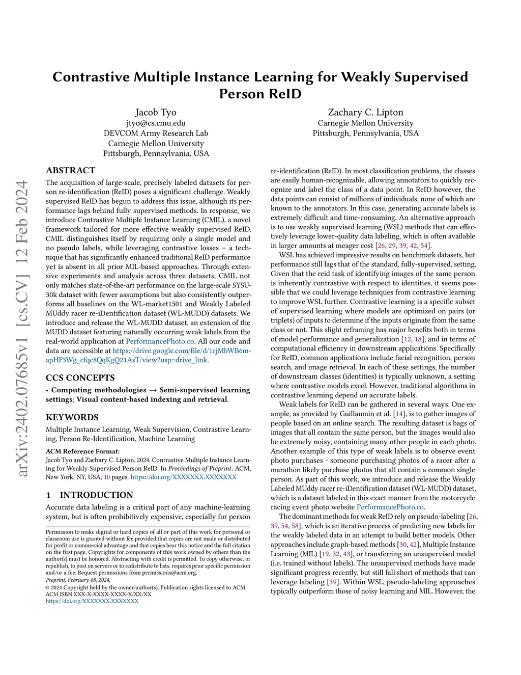 The acquisition of large-scale, precisely labeled datasets for person re-identification (ReID) poses a significant challenge. Weakly supervised ReID has begun to address this issue, although its performance lags behind fully supervised methods. In response, we introduce Contrastive Multiple Instance Learning (CMIL), a novel framework tailored for more effective weakly supervised ReID. CMIL distinguishes itself by requiring only a single model and no pseudo labels while leveraging contrastive losses -- a technique that has significantly enhanced traditional ReID performance yet is absent in all prior MIL-based approaches. Through extensive experiments and analysis across three datasets, CMIL not only matches state-of-the-art performance on the large-scale SYSU-30k dataset with fewer assumptions but also consistently outperforms all baselines on the WL-market1501 and Weakly Labeled MUddy racer re-iDentification dataset (WL-MUDD) datasets. We introduce and release the WL-MUDD dataset, an extension of the MUDD dataset featuring naturally occurring weak labels from the real-world application at PerformancePhoto.co. All our code and data are accessible at https://drive.google.com/file/d/1rjMbWB6m-apHF3Wg_cfqc8QqKgQ21AsT/view?usp=drive_link.