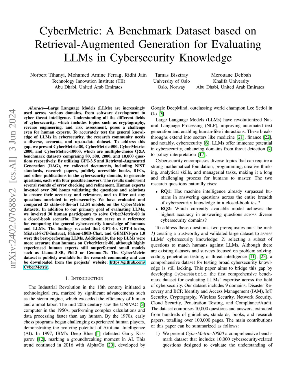 CyberMetric: A Benchmark Dataset based on Retrieval-Augmented Generation