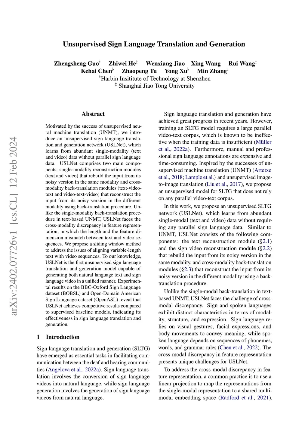 Motivated by the success of unsupervised neural machine translation (UNMT), we introduce an unsupervised sign language translation and generation network (USLNet), which learns from abundant single-modality (text and video) data without parallel sign language data. USLNet comprises two main components: single-modality reconstruction modules (text and video) that rebuild the input from its noisy version in the same modality and cross-modality back-translation modules (text-video-text and video-text-video) that reconstruct the input from its noisy version in the different modality using back-translation procedure.Unlike the single-modality back-translation procedure in text-based UNMT, USLNet faces the cross-modality discrepancy in feature representation, in which the length and the feature dimension mismatch between text and video sequences. We propose a sliding window method to address the issues of aligning variable-length text with video sequences. To our knowledge, USLNet is the first unsupervised sign language translation and generation model capable of generating both natural language text and sign language video in a unified manner. Experimental results on the BBC-Oxford Sign Language dataset (BOBSL) and Open-Domain American Sign Language dataset (OpenASL) reveal that USLNet achieves competitive results compared to supervised baseline models, indicating its effectiveness in sign language translation and generation.
