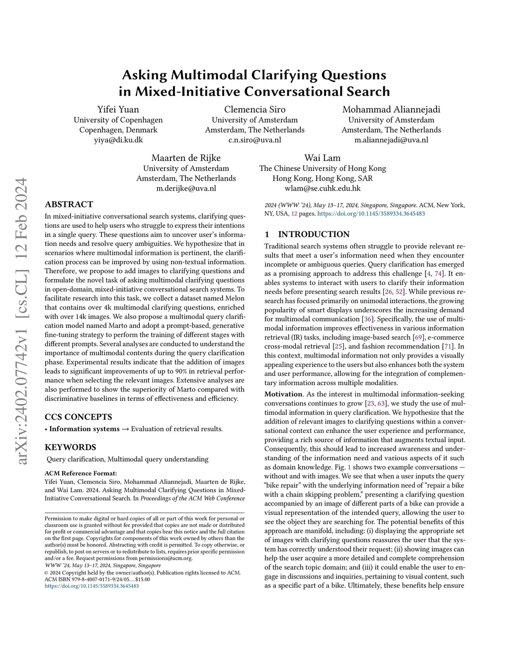 In mixed-initiative conversational search systems, clarifying questions are used to help users who struggle to express their intentions in a single query. These questions aim to uncover user's information needs and resolve query ambiguities. We hypothesize that in scenarios where multimodal information is pertinent, the clarification process can be improved by using non-textual information. Therefore, we propose to add images to clarifying questions and formulate the novel task of asking multimodal clarifying questions in open-domain, mixed-initiative conversational search systems. To facilitate research into this task, we collect a dataset named Melon that contains over 4k multimodal clarifying questions, enriched with over 14k images. We also propose a multimodal query clarification model named Marto and adopt a prompt-based, generative fine-tuning strategy to perform the training of different stages with different prompts. Several analyses are conducted to understand the importance of multimodal contents during the query clarification phase. Experimental results indicate that the addition of images leads to significant improvements of up to 90% in retrieval performance when selecting the relevant images. Extensive analyses are also performed to show the superiority of Marto compared with discriminative baselines in terms of effectiveness and efficiency.