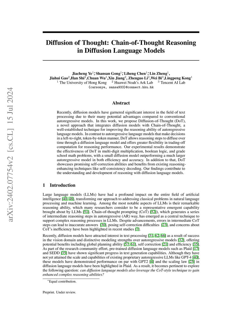 Recently, diffusion models have garnered significant interest in the field of text processing due to their many potential advantages compared to conventional autoregressive models. In this work, we propose Diffusion-of-Thought (DoT), a novel approach that integrates diffusion models with Chain-of-Thought, a well-established technique for improving the reasoning ability of autoregressive language models. In contrast to autoregressive language models that make decisions in a left-to-right, token-by-token manner, DoT allows reasoning steps to diffuse over time through a diffusion language model and offers greater flexibility in trading-off computation for reasoning performance. Our experimental results demonstrate the effectiveness of DoT in multi-digit multiplication, boolean logic, and grade school math problems, with a small diffusion model outperforming a much larger autoregressive model in both efficiency and accuracy. In addition to that, DoT showcases promising self-correction abilities and benefits from existing reasoning-enhancing techniques like self-consistency decoding. Our findings contribute to the understanding and development of reasoning with diffusion language models.
