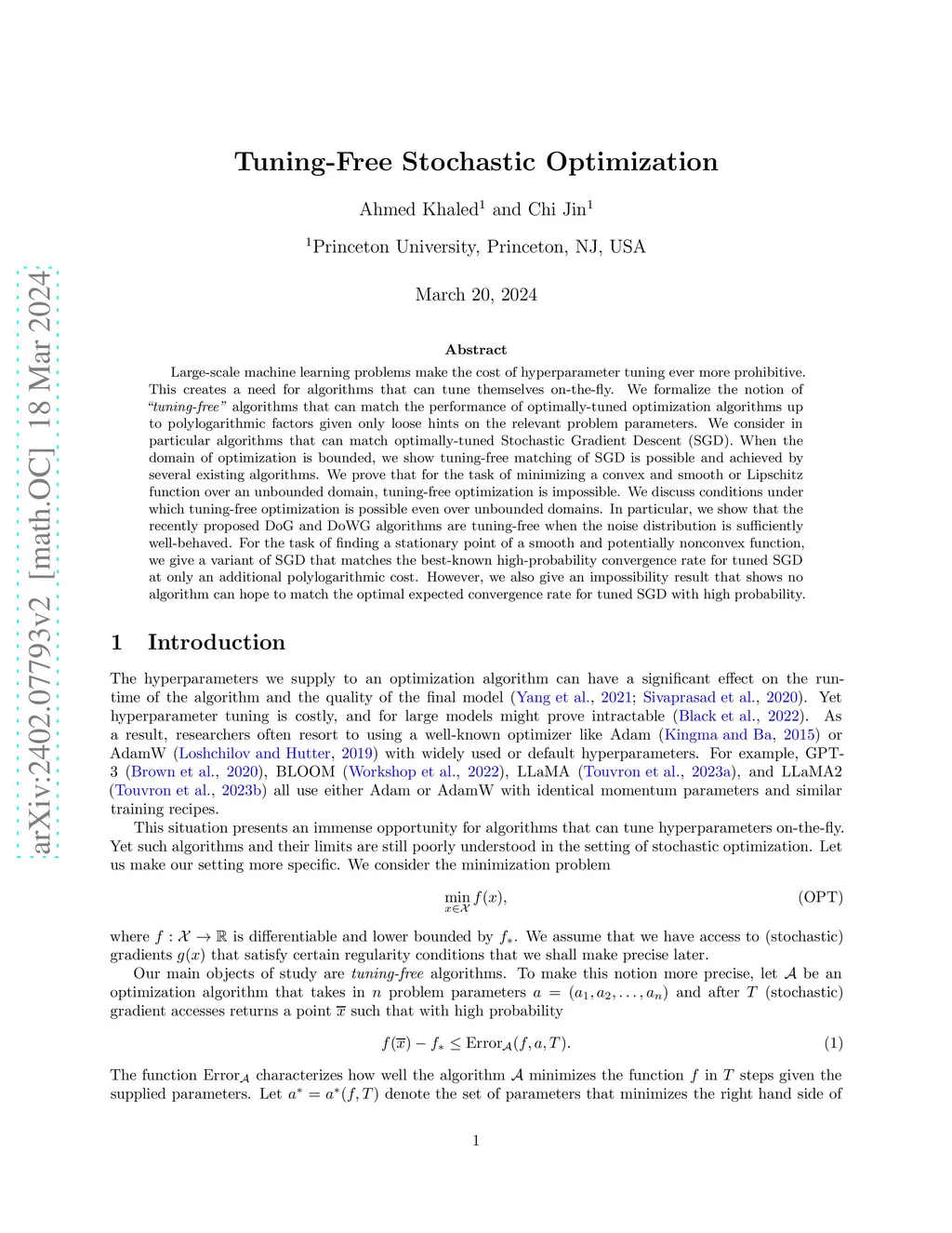 Large-scale machine learning problems make the cost of hyperparameter tuning ever more prohibitive. This creates a need for algorithms that can tune themselves on-the-fly. We formalize the notion of "tuning-free" algorithms that can match the performance of optimally-tuned optimization algorithms up to polylogarithmic factors given only loose hints on the relevant problem parameters. We consider in particular algorithms that can match optimally-tuned Stochastic Gradient Descent (SGD). When the domain of optimization is bounded, we show tuning-free matching of SGD is possible and achieved by several existing algorithms. We prove that for the task of minimizing a convex and smooth or Lipschitz function over an unbounded domain, tuning-free optimization is impossible. We discuss conditions under which tuning-free optimization is possible even over unbounded domains. In particular, we show that the recently proposed DoG and DoWG algorithms are tuning-free when the noise distribution is sufficiently well-behaved. For the task of finding a stationary point of a smooth and potentially nonconvex function, we give a variant of SGD that matches the best-known high-probability convergence rate for tuned SGD at only an additional polylogarithmic cost. However, we also give an impossibility result that shows no algorithm can hope to match the optimal expected convergence rate for tuned SGD with high probability.