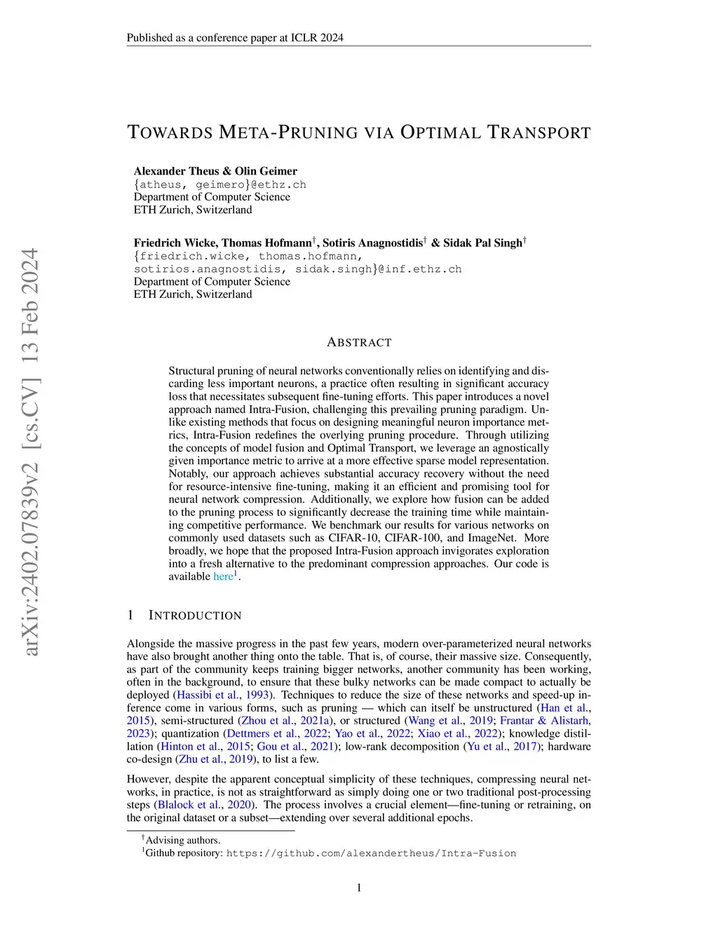 Structural pruning of neural networks conventionally relies on identifying and discarding less important neurons, a practice often resulting in significant accuracy loss that necessitates subsequent fine-tuning efforts. This paper introduces a novel approach named Intra-Fusion, challenging this prevailing pruning paradigm. Unlike existing methods that focus on designing meaningful neuron importance metrics, Intra-Fusion redefines the overlying pruning procedure. Through utilizing the concepts of model fusion and Optimal Transport, we leverage an agnostically given importance metric to arrive at a more effective sparse model representation. Notably, our approach achieves substantial accuracy recovery without the need for resource-intensive fine-tuning, making it an efficient and promising tool for neural network compression. Additionally, we explore how fusion can be added to the pruning process to significantly decrease the training time while maintaining competitive performance. We benchmark our results for various networks on commonly used datasets such as CIFAR-10, CIFAR-100, and ImageNet. More broadly, we hope that the proposed Intra-Fusion approach invigorates exploration into a fresh alternative to the predominant compression approaches. Our code is available here: https://github.com/alexandertheus/Intra-Fusion.