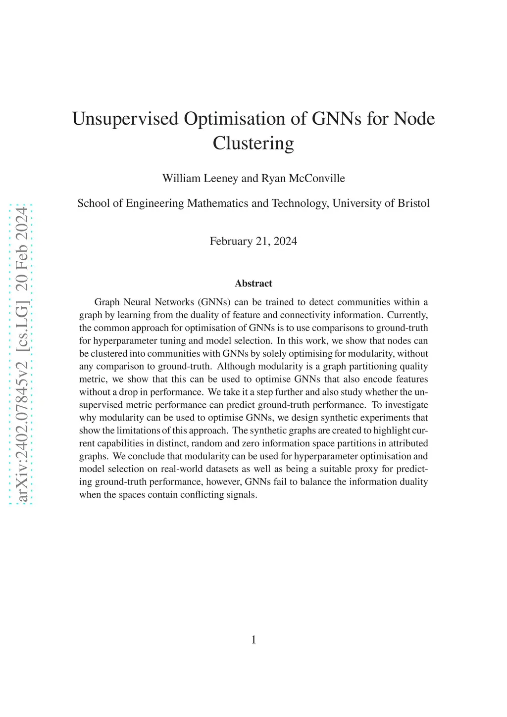 Graph Neural Networks (GNNs) can be trained to detect communities within a graph by learning from the duality of feature and connectivity information. Currently, the common approach for optimisation of GNNs is to use comparisons to ground-truth for hyperparameter tuning and model selection. In this work, we show that nodes can be clustered into communities with GNNs by solely optimising for modularity, without any comparison to ground-truth. Although modularity is a graph partitioning quality metric, we show that this can be used to optimise GNNs that also encode features without a drop in performance. We take it a step further and also study whether the unsupervised metric performance can predict ground-truth performance. To investigate why modularity can be used to optimise GNNs, we design synthetic experiments that show the limitations of this approach. The synthetic graphs are created to highlight current capabilities in distinct, random and zero information space partitions in attributed graphs. We conclude that modularity can be used for hyperparameter optimisation and model selection on real-world datasets as well as being a suitable proxy for predicting ground-truth performance, however, GNNs fail to balance the information duality when the spaces contain conflicting signals.