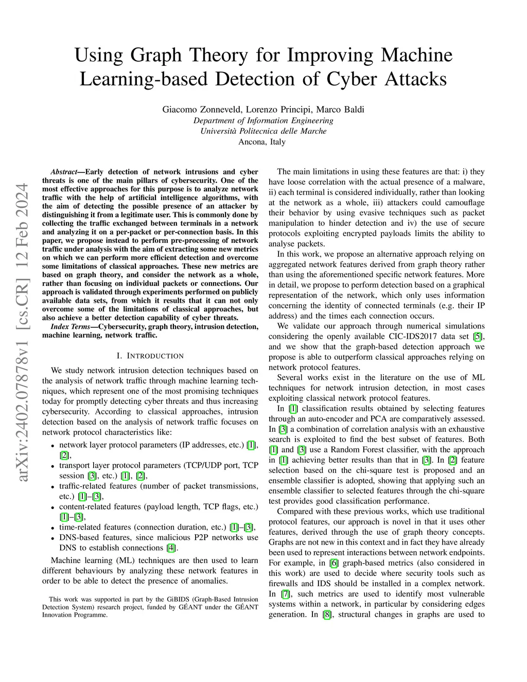 Early detection of network intrusions and cyber threats is one of the main pillars of cybersecurity. One of the most effective approaches for this purpose is to analyze network traffic with the help of artificial intelligence algorithms, with the aim of detecting the possible presence of an attacker by distinguishing it from a legitimate user. This is commonly done by collecting the traffic exchanged between terminals in a network and analyzing it on a per-packet or per-connection basis. In this paper, we propose instead to perform pre-processing of network traffic under analysis with the aim of extracting some new metrics on which we can perform more efficient detection and overcome some limitations of classical approaches. These new metrics are based on graph theory, and consider the network as a whole, rather than focusing on individual packets or connections. Our approach is validated through experiments performed on publicly available data sets, from which it results that it can not only overcome some of the limitations of classical approaches, but also achieve a better detection capability of cyber threats.
