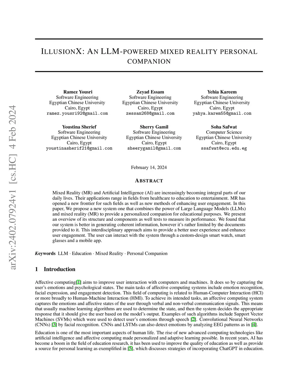 Mixed Reality (MR) and Artificial Intelligence (AI) are increasingly becoming integral parts of our daily lives. Their applications range in fields from healthcare to education to entertainment. MR has opened a new frontier for such fields as well as new methods of enhancing user engagement. In this paper, We propose a new system one that combines the power of Large Language Models (LLMs) and mixed reality (MR) to provide a personalized companion for educational purposes. We present an overview of its structure and components as well tests to measure its performance. We found that our system is better in generating coherent information, however it's rather limited by the documents provided to it. This interdisciplinary approach aims to provide a better user experience and enhance user engagement. The user can interact with the system through a custom-design smart watch, smart glasses and a mobile app.
