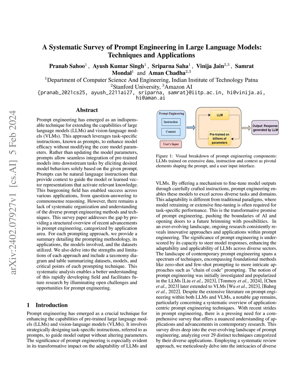 Prompt engineering has emerged as an indispensable technique for extending the capabilities of large language models (LLMs) and vision-language models (VLMs). This approach leverages task-specific instructions, known as prompts, to enhance model efficacy without modifying the core model parameters. Rather than updating the model parameters, prompts allow seamless integration of pre-trained models into downstream tasks by eliciting desired model behaviors solely based on the given prompt. Prompts can be natural language instructions that provide context to guide the model or learned vector representations that activate relevant knowledge. This burgeoning field has enabled success across various applications, from question-answering to commonsense reasoning. However, there remains a lack of systematic organization and understanding of the diverse prompt engineering methods and techniques. This survey paper addresses the gap by providing a structured overview of recent advancements in prompt engineering, categorized by application area. For each prompting approach, we provide a summary detailing the prompting methodology, its applications, the models involved, and the datasets utilized. We also delve into the strengths and limitations of each approach and include a taxonomy diagram and table summarizing datasets, models, and critical points of each prompting technique. This systematic analysis enables a better understanding of this rapidly developing field and facilitates future research by illuminating open challenges and opportunities for prompt engineering.