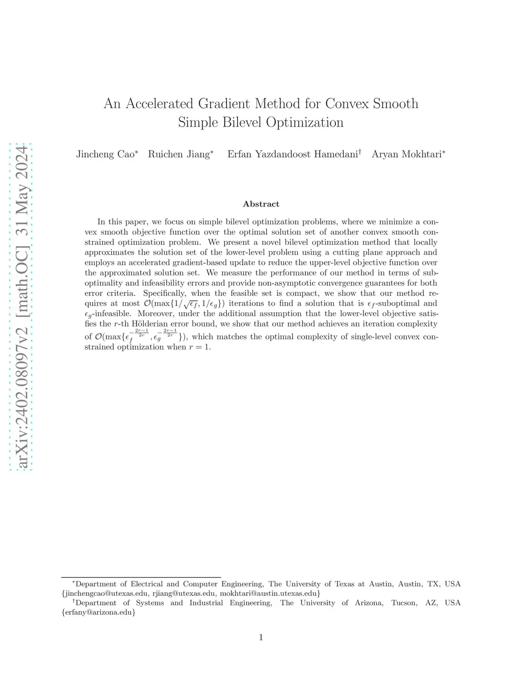 In this paper, we focus on simple bilevel optimization problems, where we minimize a convex smooth objective function over the optimal solution set of another convex smooth constrained optimization problem. We present a novel bilevel optimization method that locally approximates the solution set of the lower-level problem using a cutting plane approach and employs an accelerated gradient-based update to reduce the upper-level objective function over the approximated solution set. We measure the performance of our method in terms of suboptimality and infeasibility errors and provide non-asymptotic convergence guarantees for both error criteria. Specifically, when the feasible set is compact, we show that our method requires at most iterations to find a solution that is -suboptimal and -infeasible. Moreover, under the additional assumption that the lower-level objective satisfies the -th H\"olderian error bound, we show that our method achieves an iteration complexity of , which matches the optimal complexity of single-level convex constrained optimization when .