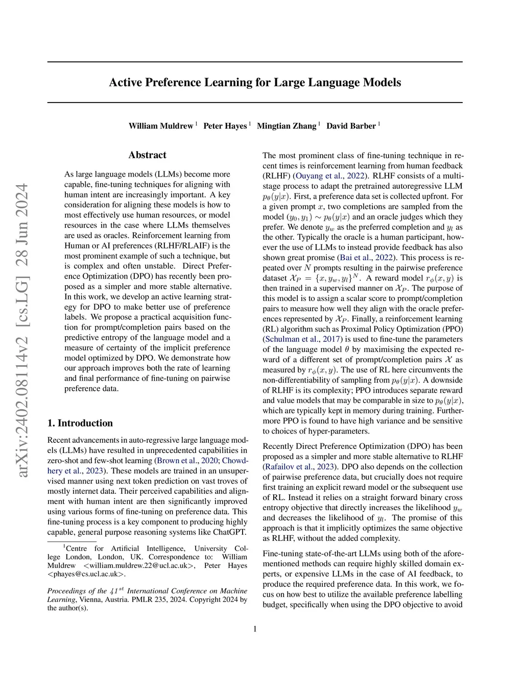 As large language models (LLMs) become more capable, fine-tuning techniques for aligning with human intent are increasingly important. A key consideration for aligning these models is how to most effectively use human resources, or model resources in the case where LLMs themselves are used as oracles. Reinforcement learning from Human or AI preferences (RLHF/RLAIF) is the most prominent example of such a technique, but is complex and often unstable. Direct Preference Optimization (DPO) has recently been proposed as a simpler and more stable alternative. In this work, we develop an active learning strategy for DPO to make better use of preference labels. We propose a practical acquisition function for prompt/completion pairs based on the predictive entropy of the language model and a measure of certainty of the implicit preference model optimized by DPO. We demonstrate how our approach improves both the rate of learning and final performance of fine-tuning on pairwise preference data.