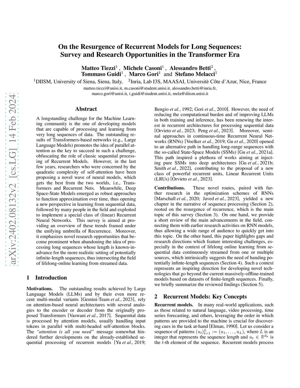 A longstanding challenge for the Machine Learning community is the one of developing models that are capable of processing and learning from very long sequences of data. The outstanding results of Transformers-based networks (e.g., Large Language Models) promotes the idea of parallel attention as the key to succeed in such a challenge, obfuscating the role of classic sequential processing of Recurrent Models. However, in the last few years, researchers who were concerned by the quadratic complexity of self-attention have been proposing a novel wave of neural models, which gets the best from the two worlds, i.e., Transformers and Recurrent Nets. Meanwhile, Deep Space-State Models emerged as robust approaches to function approximation over time, thus opening a new perspective in learning from sequential data, followed by many people in the field and exploited to implement a special class of (linear) Recurrent Neural Networks. This survey is aimed at providing an overview of these trends framed under the unifying umbrella of Recurrence. Moreover, it emphasizes novel research opportunities that become prominent when abandoning the idea of processing long sequences whose length is known-in-advance for the more realistic setting of potentially infinite-length sequences, thus intersecting the field of lifelong-online learning from streamed data.