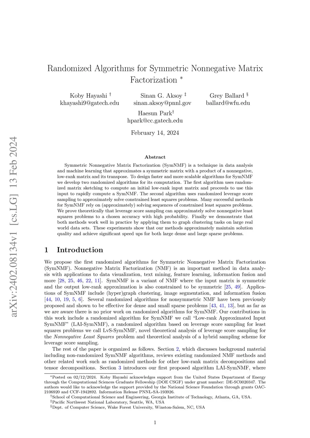 Symmetric Nonnegative Matrix Factorization (SymNMF) is a technique in data analysis and machine learning that approximates a symmetric matrix with a product of a nonnegative, low-rank matrix and its transpose. To design faster and more scalable algorithms for SymNMF we develop two randomized algorithms for its computation. The first algorithm uses randomized matrix sketching to compute an initial low-rank input matrix and proceeds to use this input to rapidly compute a SymNMF. The second algorithm uses randomized leverage score sampling to approximately solve constrained least squares problems. Many successful methods for SymNMF rely on (approximately) solving sequences of constrained least squares problems. We prove theoretically that leverage score sampling can approximately solve nonnegative least squares problems to a chosen accuracy with high probability. Finally we demonstrate that both methods work well in practice by applying them to graph clustering tasks on large real world data sets. These experiments show that our methods approximately maintain solution quality and achieve significant speed ups for both large dense and large sparse problems.