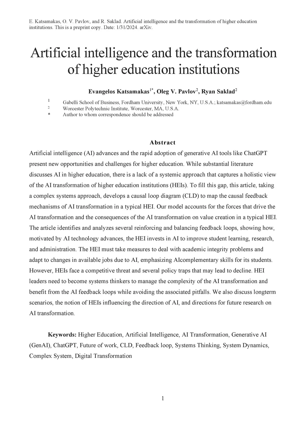 Artificial intelligence (AI) advances and the rapid adoption of generative AI tools like ChatGPT present new opportunities and challenges for higher education. While substantial literature discusses AI in higher education, there is a lack of a systemic approach that captures a holistic view of the AI transformation of higher education institutions (HEIs). To fill this gap, this article, taking a complex systems approach, develops a causal loop diagram (CLD) to map the causal feedback mechanisms of AI transformation in a typical HEI. Our model accounts for the forces that drive the AI transformation and the consequences of the AI transformation on value creation in a typical HEI. The article identifies and analyzes several reinforcing and balancing feedback loops, showing how, motivated by AI technology advances, the HEI invests in AI to improve student learning, research, and administration. The HEI must take measures to deal with academic integrity problems and adapt to changes in available jobs due to AI, emphasizing AI-complementary skills for its students. However, HEIs face a competitive threat and several policy traps that may lead to decline. HEI leaders need to become systems thinkers to manage the complexity of the AI transformation and benefit from the AI feedback loops while avoiding the associated pitfalls. We also discuss long-term scenarios, the notion of HEIs influencing the direction of AI, and directions for future research on AI transformation.