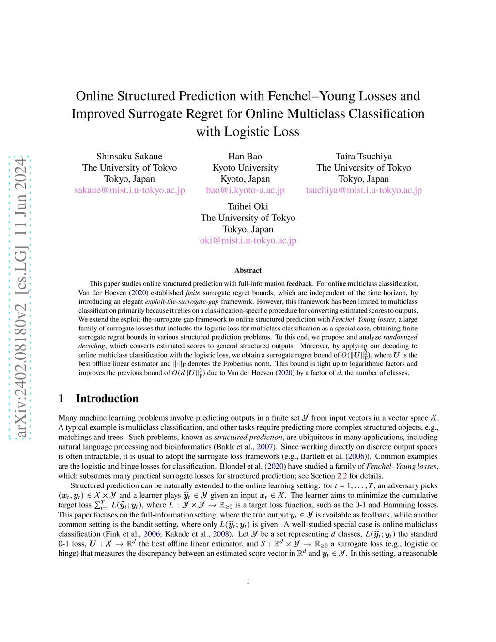 This paper studies online structured prediction with full-information feedback. For online multiclass classification, Van der Hoeven (2020) established \emph{finite} surrogate regret bounds, which are independent of the time horizon, by introducing an elegant \emph{exploit-the-surrogate-gap} framework. However, this framework has been limited to multiclass classification primarily because it relies on a classification-specific procedure for converting estimated scores to outputs. We extend the exploit-the-surrogate-gap framework to online structured prediction with \emph{Fenchel--Young losses}, a large family of surrogate losses that includes the logistic loss for multiclass classification as a special case, obtaining finite surrogate regret bounds in various structured prediction problems. To this end, we propose and analyze \emph{randomized decoding}, which converts estimated scores to general structured outputs. Moreover, by applying our decoding to online multiclass classification with the logistic loss, we obtain a surrogate regret bound of , where is the best offline linear estimator and denotes the Frobenius norm. This bound is tight up to logarithmic factors and improves the previous bound of due to Van der Hoeven (2020) by a factor of , the number of classes.