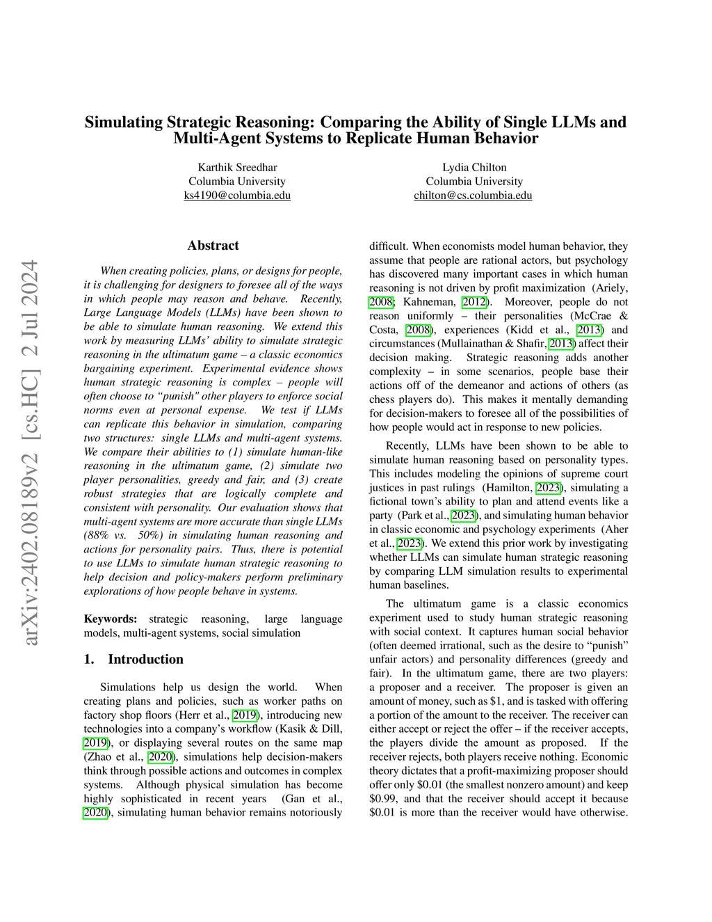 When creating policies, plans, or designs for people, it is challenging for designers to foresee all of the ways in which people may reason and behave. Recently, Large Language Models (LLMs) have been shown to be able to simulate human reasoning. We extend this work by measuring LLMs ability to simulate strategic reasoning in the ultimatum game, a classic economics bargaining experiment. Experimental evidence shows human strategic reasoning is complex; people will often choose to punish other players to enforce social norms even at personal expense. We test if LLMs can replicate this behavior in simulation, comparing two structures: single LLMs and multi-agent systems. We compare their abilities to (1) simulate human-like reasoning in the ultimatum game, (2) simulate two player personalities, greedy and fair, and (3) create robust strategies that are logically complete and consistent with personality. Our evaluation shows that multi-agent systems are more accurate than single LLMs (88 percent vs. 50 percent) in simulating human reasoning and actions for personality pairs. Thus, there is potential to use LLMs to simulate human strategic reasoning to help decision and policy-makers perform preliminary explorations of how people behave in systems.