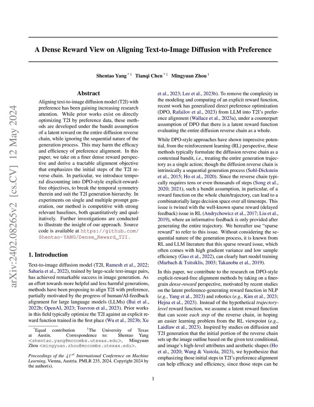 Aligning text-to-image diffusion model (T2I) with preference has been gaining increasing research attention. While prior works exist on directly optimizing T2I by preference data, these methods are developed under the bandit assumption of a latent reward on the entire diffusion reverse chain, while ignoring the sequential nature of the generation process. This may harm the efficacy and efficiency of preference alignment. In this paper, we take on a finer dense reward perspective and derive a tractable alignment objective that emphasizes the initial steps of the T2I reverse chain. In particular, we introduce temporal discounting into DPO-style explicit-reward-free objectives, to break the temporal symmetry therein and suit the T2I generation hierarchy. In experiments on single and multiple prompt generation, our method is competitive with strong relevant baselines, both quantitatively and qualitatively. Further investigations are conducted to illustrate the insight of our approach.