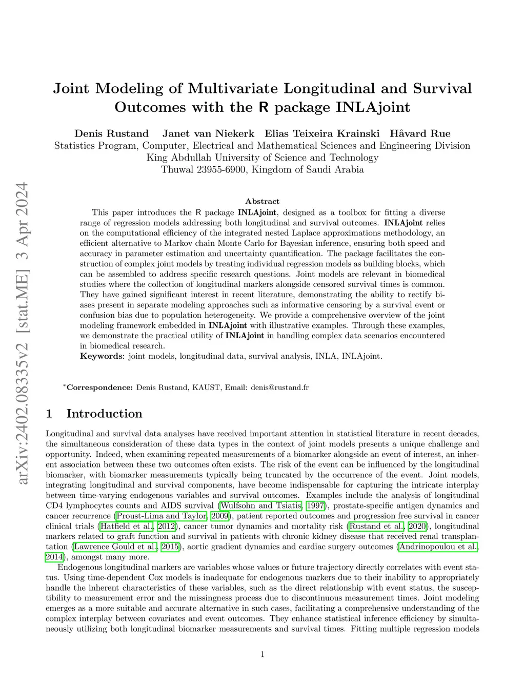 This paper introduces the R package INLAjoint, designed as a toolbox for fitting a diverse range of regression models addressing both longitudinal and survival outcomes. INLAjoint relies on the computational efficiency of the integrated nested Laplace approximations methodology, an efficient alternative to Markov chain Monte Carlo for Bayesian inference, ensuring both speed and accuracy in parameter estimation and uncertainty quantification. The package facilitates the construction of complex joint models by treating individual regression models as building blocks, which can be assembled to address specific research questions. Joint models are relevant in biomedical studies where the collection of longitudinal markers alongside censored survival times is common. They have gained significant interest in recent literature, demonstrating the ability to rectify biases present in separate modeling approaches such as informative censoring by a survival event or confusion bias due to population heterogeneity. We provide a comprehensive overview of the joint modeling framework embedded in INLAjoint with illustrative examples. Through these examples, we demonstrate the practical utility of INLAjoint in handling complex data scenarios encountered in biomedical research.