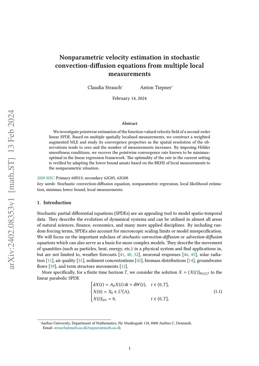 We investigate pointwise estimation of the function-valued velocity field of a second-order linear SPDE. Based on multiple spatially localised measurements, we construct a weighted augmented MLE and study its convergence properties as the spatial resolution of the observations tends to zero and the number of measurements increases. By imposing H\"older smoothness conditions, we recover the pointwise convergence rate known to be minimax-optimal in the linear regression framework. The optimality of the rate in the current setting is verified by adapting the lower bound ansatz based on the RKHS of local measurements to the nonparametric situation.