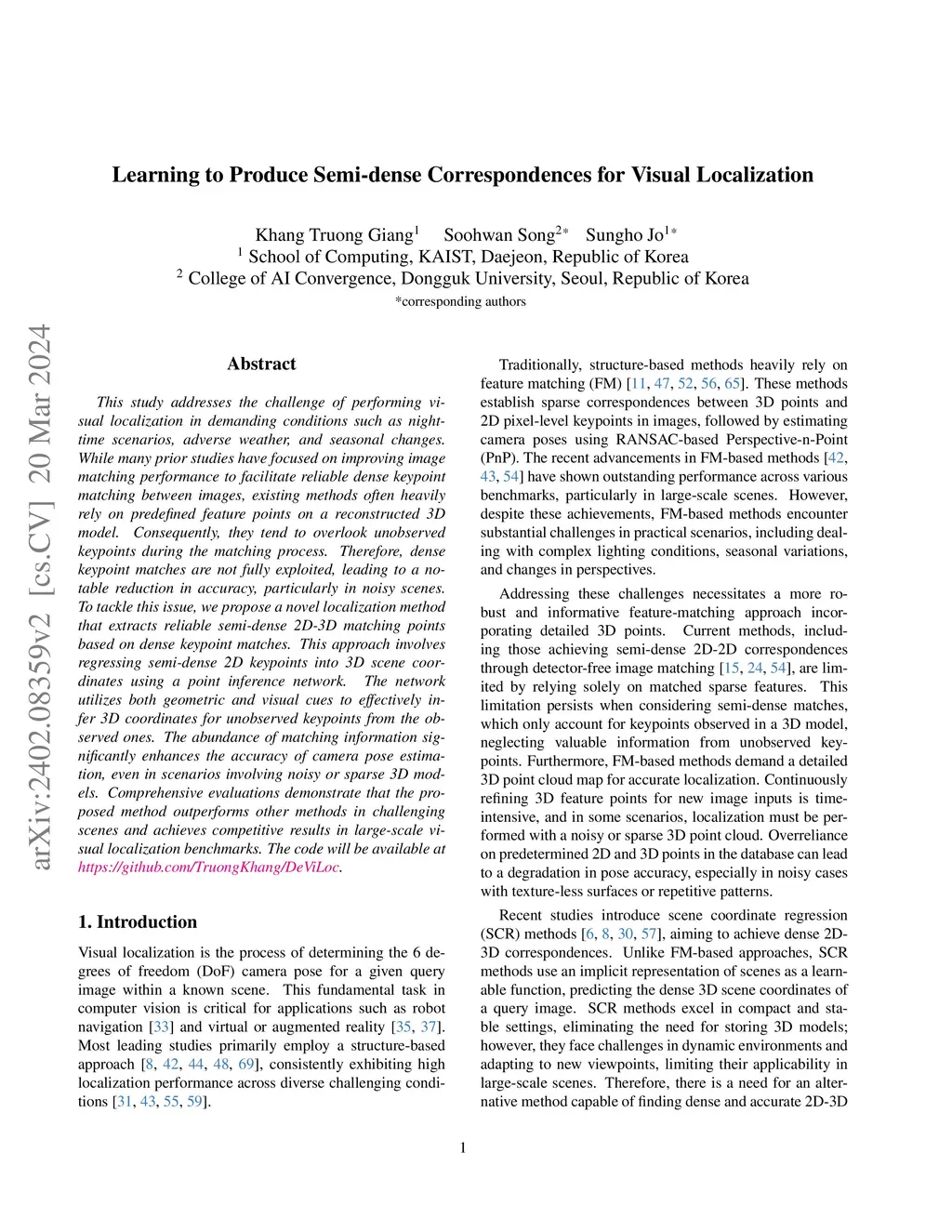 This study addresses the challenge of performing visual localization in demanding conditions such as night-time scenarios, adverse weather, and seasonal changes. While many prior studies have focused on improving image-matching performance to facilitate reliable dense keypoint matching between images, existing methods often heavily rely on predefined feature points on a reconstructed 3D model. Consequently, they tend to overlook unobserved keypoints during the matching process. Therefore, dense keypoint matches are not fully exploited, leading to a notable reduction in accuracy, particularly in noisy scenes. To tackle this issue, we propose a novel localization method that extracts reliable semi-dense 2D-3D matching points based on dense keypoint matches. This approach involves regressing semi-dense 2D keypoints into 3D scene coordinates using a point inference network. The network utilizes both geometric and visual cues to effectively infer 3D coordinates for unobserved keypoints from the observed ones. The abundance of matching information significantly enhances the accuracy of camera pose estimation, even in scenarios involving noisy or sparse 3D models. Comprehensive evaluations demonstrate that the proposed method outperforms other methods in challenging scenes and achieves competitive results in large-scale visual localization benchmarks. The code will be available.