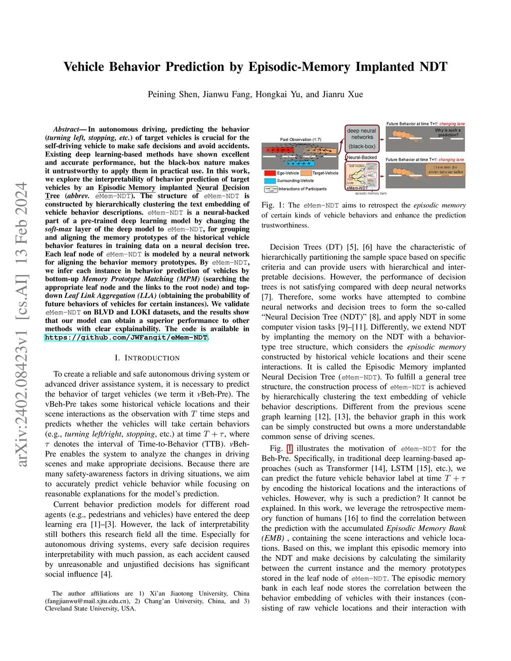 In autonomous driving, predicting the behavior (turning left, stopping, etc.) of target vehicles is crucial for the self-driving vehicle to make safe decisions and avoid accidents. Existing deep learning-based methods have shown excellent and accurate performance, but the black-box nature makes it untrustworthy to apply them in practical use. In this work, we explore the interpretability of behavior prediction of target vehicles by an Episodic Memory implanted Neural Decision Tree (abbrev. eMem-NDT). The structure of eMem-NDT is constructed by hierarchically clustering the text embedding of vehicle behavior descriptions. eMem-NDT is a neural-backed part of a pre-trained deep learning model by changing the soft-max layer of the deep model to eMem-NDT, for grouping and aligning the memory prototypes of the historical vehicle behavior features in training data on a neural decision tree. Each leaf node of eMem-NDT is modeled by a neural network for aligning the behavior memory prototypes. By eMem-NDT, we infer each instance in behavior prediction of vehicles by bottom-up Memory Prototype Matching (MPM) (searching the appropriate leaf node and the links to the root node) and top-down Leaf Link Aggregation (LLA) (obtaining the probability of future behaviors of vehicles for certain instances). We validate eMem-NDT on BLVD and LOKI datasets, and the results show that our model can obtain a superior performance to other methods with clear explainability. The code is available at https://github.com/JWFangit/eMem-NDT.