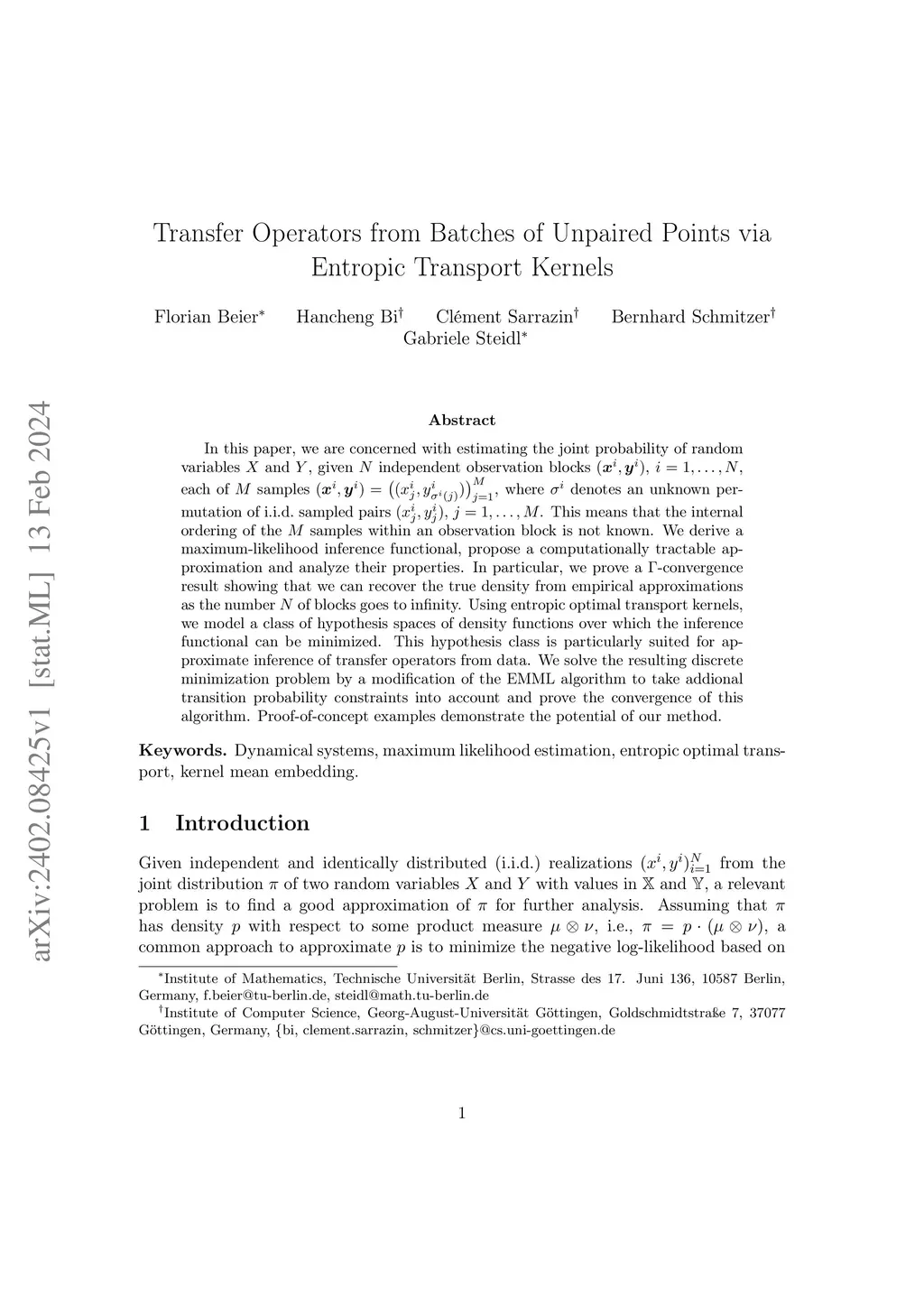 In this paper, we are concerned with estimating the joint probability of random variables and , given independent observation blocks , , each of samples , where denotes an unknown permutation of i.i.d. sampled pairs , . This means that the internal ordering of the samples within an observation block is not known. We derive a maximum-likelihood inference functional, propose a computationally tractable approximation and analyze their properties. In particular, we prove a -convergence result showing that we can recover the true density from empirical approximations as the number of blocks goes to infinity. Using entropic optimal transport kernels, we model a class of hypothesis spaces of density functions over which the inference functional can be minimized. This hypothesis class is particularly suited for approximate inference of transfer operators from data. We solve the resulting discrete minimization problem by a modification of the EMML algorithm to take addional transition probability constraints into account and prove the convergence of this algorithm. Proof-of-concept examples demonstrate the potential of our method.