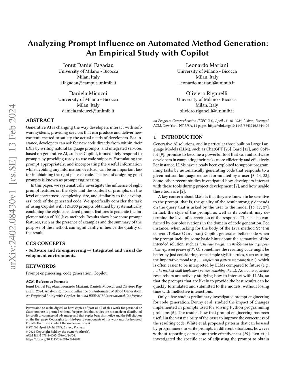 Generative AI is changing the way developers interact with software systems, providing services that can produce and deliver new content, crafted to satisfy the actual needs of developers. For instance, developers can ask for new code directly from within their IDEs by writing natural language prompts, and integrated services based on generative AI, such as Copilot, immediately respond to prompts by providing ready-to-use code snippets. Formulating the prompt appropriately, and incorporating the useful information while avoiding any information overload, can be an important factor in obtaining the right piece of code. The task of designing good prompts is known as prompt engineering. In this paper, we systematically investigate the influence of eight prompt features on the style and the content of prompts, on the level of correctness, complexity, size, and similarity to the developers' code of the generated code. We specifically consider the task of using Copilot with 124,800 prompts obtained by systematically combining the eight considered prompt features to generate the implementation of 200 Java methods. Results show how some prompt features, such as the presence of examples and the summary of the purpose of the method, can significantly influence the quality of the result.