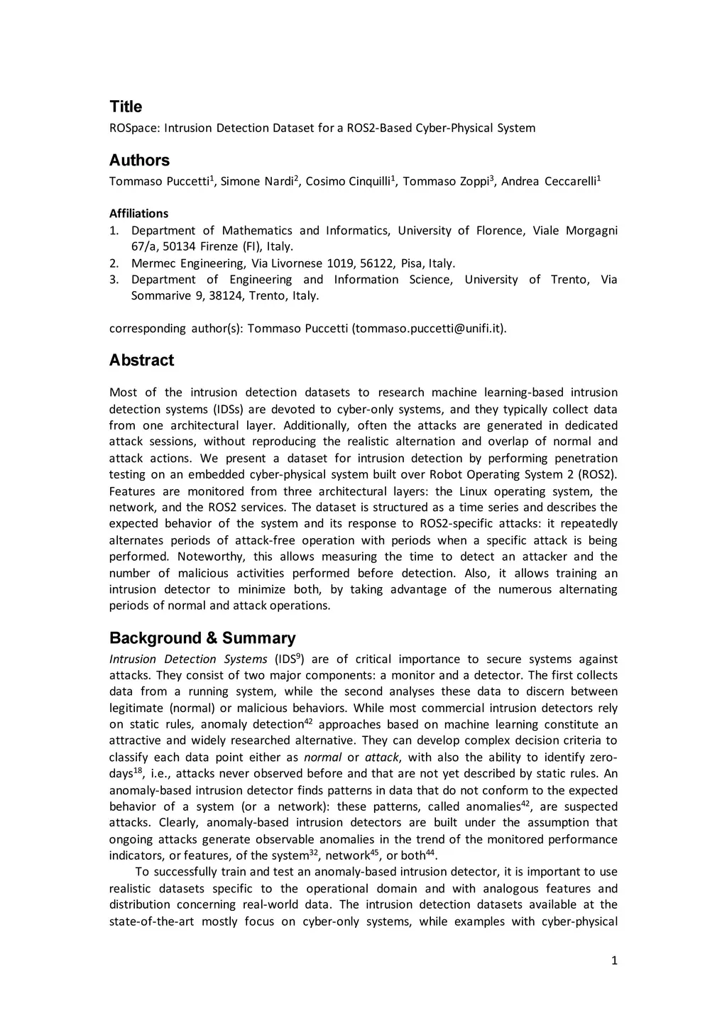 ROSpace: Intrusion Detection Dataset for a ROS2-Based Cyber-Physical