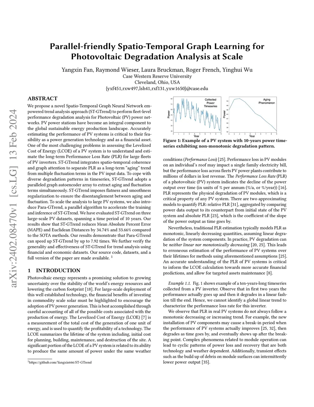 We propose a novel Spatio-Temporal Graph Neural Network empowered trend analysis approach (ST-GTrend) to perform fleet-level performance degradation analysis for Photovoltaic (PV) power networks. PV power stations have become an integral component to the global sustainable energy production landscape. Accurately estimating the performance of PV systems is critical to their feasibility as a power generation technology and as a financial asset. One of the most challenging problems in assessing the Levelized Cost of Energy (LCOE) of a PV system is to understand and estimate the long-term Performance Loss Rate (PLR) for large fleets of PV inverters. ST-GTrend integrates spatio-temporal coherence and graph attention to separate PLR as a long-term "aging" trend from multiple fluctuation terms in the PV input data. To cope with diverse degradation patterns in timeseries, ST-GTrend adopts a paralleled graph autoencoder array to extract aging and fluctuation terms simultaneously. ST-GTrend imposes flatness and smoothness regularization to ensure the disentanglement between aging and fluctuation. To scale the analysis to large PV systems, we also introduce Para-GTrend, a parallel algorithm to accelerate the training and inference of ST-GTrend. We have evaluated ST-GTrend on three large-scale PV datasets, spanning a time period of 10 years. Our results show that ST-GTrend reduces Mean Absolute Percent Error (MAPE) and Euclidean Distances by 34.74% and 33.66% compared to the SOTA methods. Our results demonstrate that Para-GTrend can speed up ST-GTrend by up to 7.92 times. We further verify the generality and effectiveness of ST-GTrend for trend analysis using financial and economic datasets.