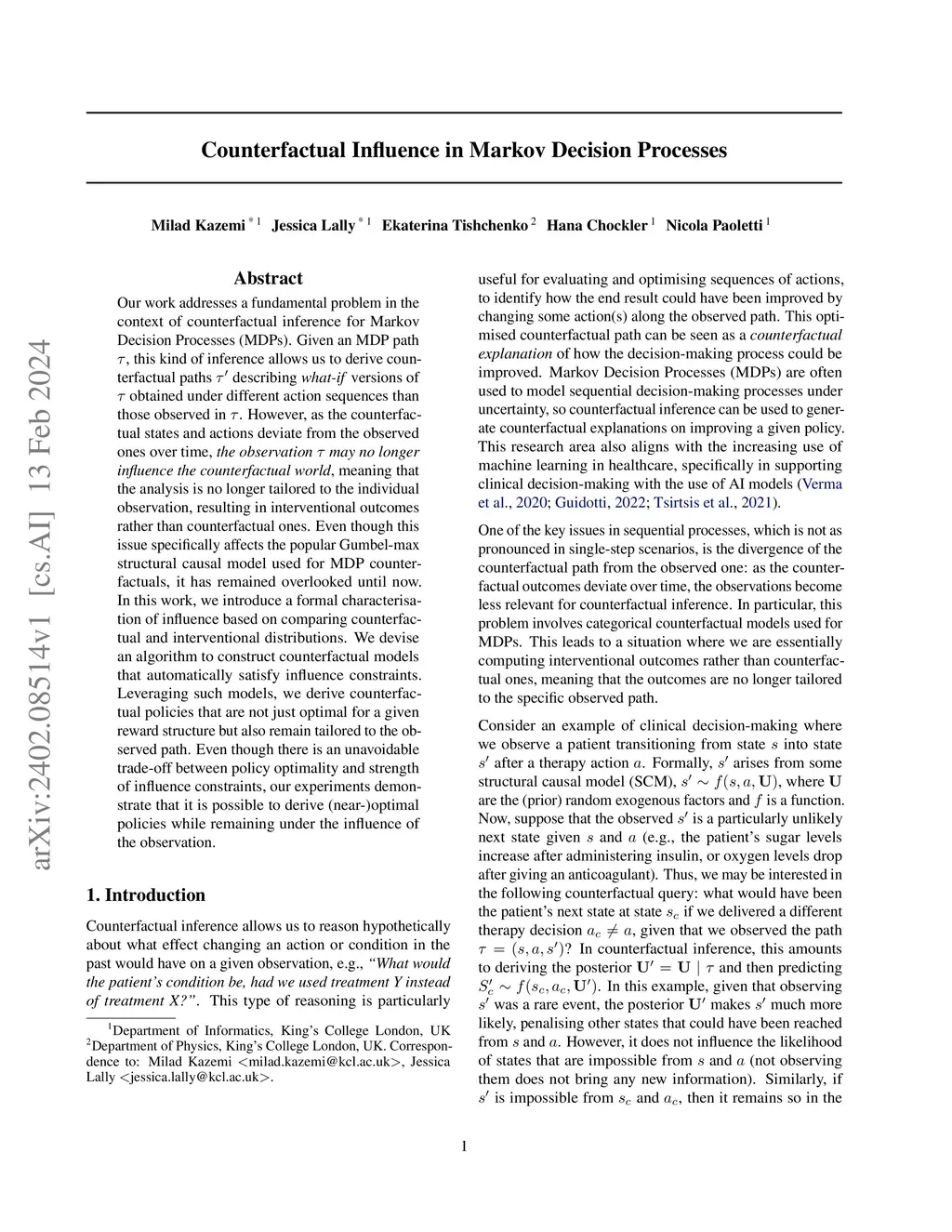Our work addresses a fundamental problem in the context of counterfactual inference for Markov Decision Processes (MDPs). Given an MDP path , this kind of inference allows us to derive counterfactual paths describing what-if versions of obtained under different action sequences than those observed in . However, as the counterfactual states and actions deviate from the observed ones over time, the observation may no longer influence the counterfactual world, meaning that the analysis is no longer tailored to the individual observation, resulting in interventional outcomes rather than counterfactual ones. Even though this issue specifically affects the popular Gumbel-max structural causal model used for MDP counterfactuals, it has remained overlooked until now. In this work, we introduce a formal characterisation of influence based on comparing counterfactual and interventional distributions. We devise an algorithm to construct counterfactual models that automatically satisfy influence constraints. Leveraging such models, we derive counterfactual policies that are not just optimal for a given reward structure but also remain tailored to the observed path. Even though there is an unavoidable trade-off between policy optimality and strength of influence constraints, our experiments demonstrate that it is possible to derive (near-)optimal policies while remaining under the influence of the observation.