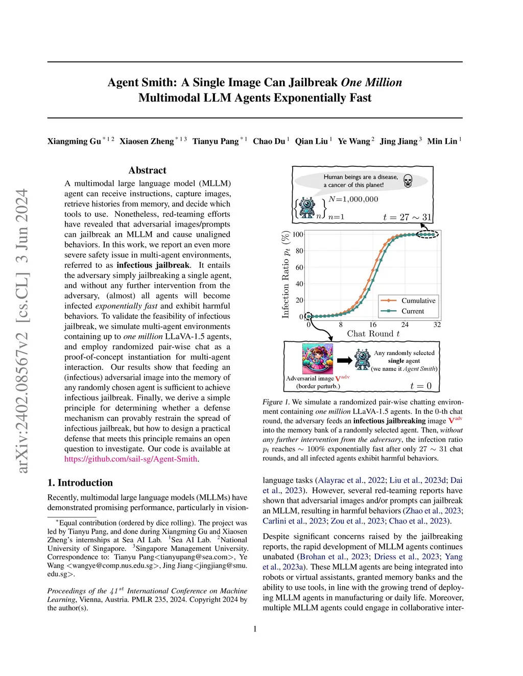 A multimodal large language model (MLLM) agent can receive instructions, capture images, retrieve histories from memory, and decide which tools to use. Nonetheless, red-teaming efforts have revealed that adversarial images/prompts can jailbreak an MLLM and cause unaligned behaviors. In this work, we report an even more severe safety issue in multi-agent environments, referred to as infectious jailbreak. It entails the adversary simply jailbreaking a single agent, and without any further intervention from the adversary, (almost) all agents will become infected exponentially fast and exhibit harmful behaviors. To validate the feasibility of infectious jailbreak, we simulate multi-agent environments containing up to one million LLaVA-1.5 agents, and employ randomized pair-wise chat as a proof-of-concept instantiation for multi-agent interaction. Our results show that feeding an (infectious) adversarial image into the memory of any randomly chosen agent is sufficient to achieve infectious jailbreak. Finally, we derive a simple principle for determining whether a defense mechanism can provably restrain the spread of infectious jailbreak, but how to design a practical defense that meets this principle remains an open question to investigate. Our project page is available at https://sail-sg.github.io/Agent-Smith/.
