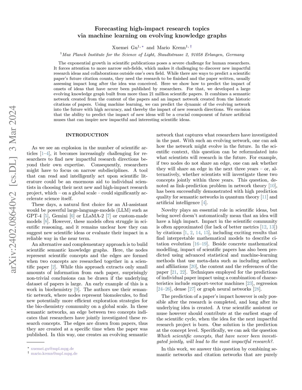 Forecasting high-impact research topics via machine learning on evolving knowledge graphs