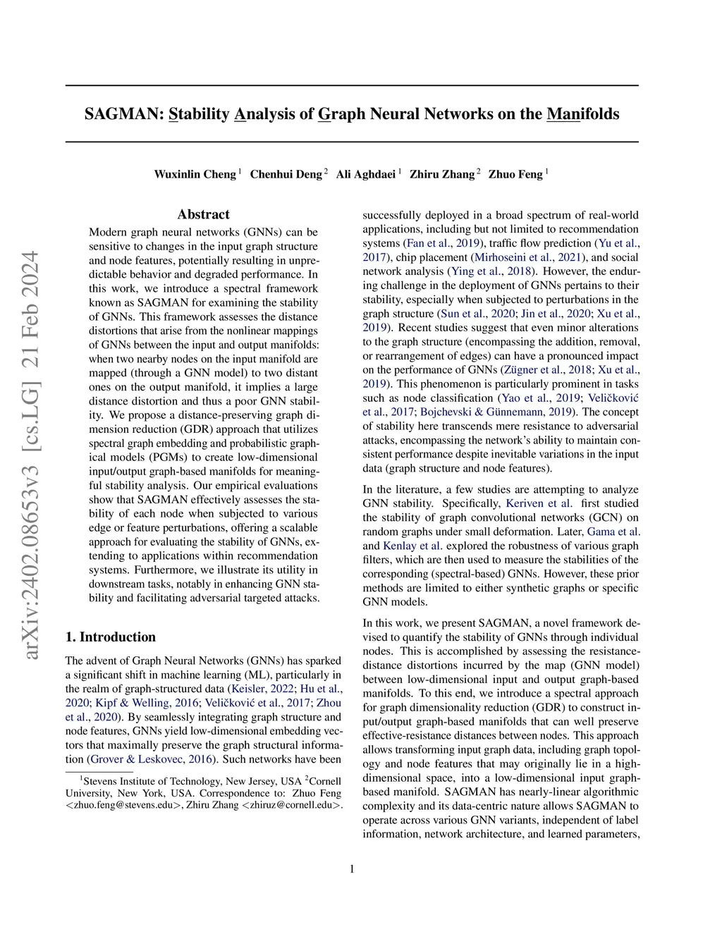 Modern graph neural networks (GNNs) can be sensitive to changes in the input graph structure and node features, potentially resulting in unpredictable behavior and degraded performance. In this work, we introduce a spectral framework known as SAGMAN for examining the stability of GNNs. This framework assesses the distance distortions that arise from the nonlinear mappings of GNNs between the input and output manifolds: when two nearby nodes on the input manifold are mapped (through a GNN model) to two distant ones on the output manifold, it implies a large distance distortion and thus a poor GNN stability. We propose a distance-preserving graph dimension reduction (GDR) approach that utilizes spectral graph embedding and probabilistic graphical models (PGMs) to create low-dimensional input/output graph-based manifolds for meaningful stability analysis. Our empirical evaluations show that SAGMAN effectively assesses the stability of each node when subjected to various edge or feature perturbations, offering a scalable approach for evaluating the stability of GNNs, extending to applications within recommendation systems. Furthermore, we illustrate its utility in downstream tasks, notably in enhancing GNN stability and facilitating adversarial targeted attacks.