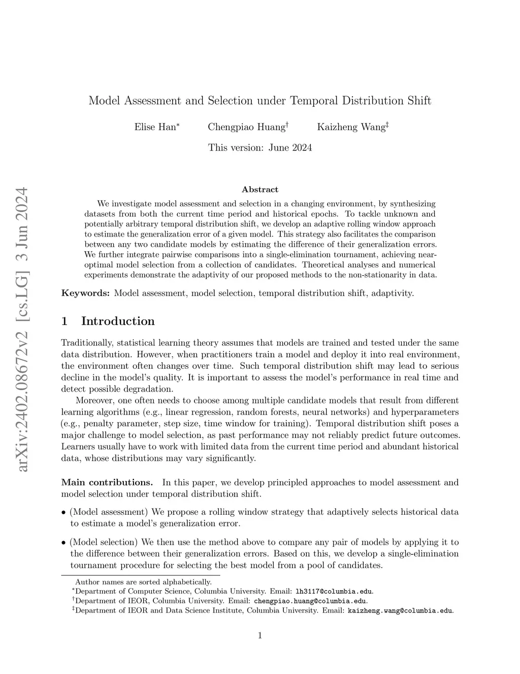 We investigate model assessment and selection in a changing environment, by synthesizing datasets from both the current time period and historical epochs. To tackle unknown and potentially arbitrary temporal distribution shift, we develop an adaptive rolling window approach to estimate the generalization error of a given model. This strategy also facilitates the comparison between any two candidate models by estimating the difference of their generalization errors. We further integrate pairwise comparisons into a single-elimination tournament, achieving near-optimal model selection from a collection of candidates. Theoretical analyses and numerical experiments demonstrate the adaptivity of our proposed methods to the non-stationarity in data.