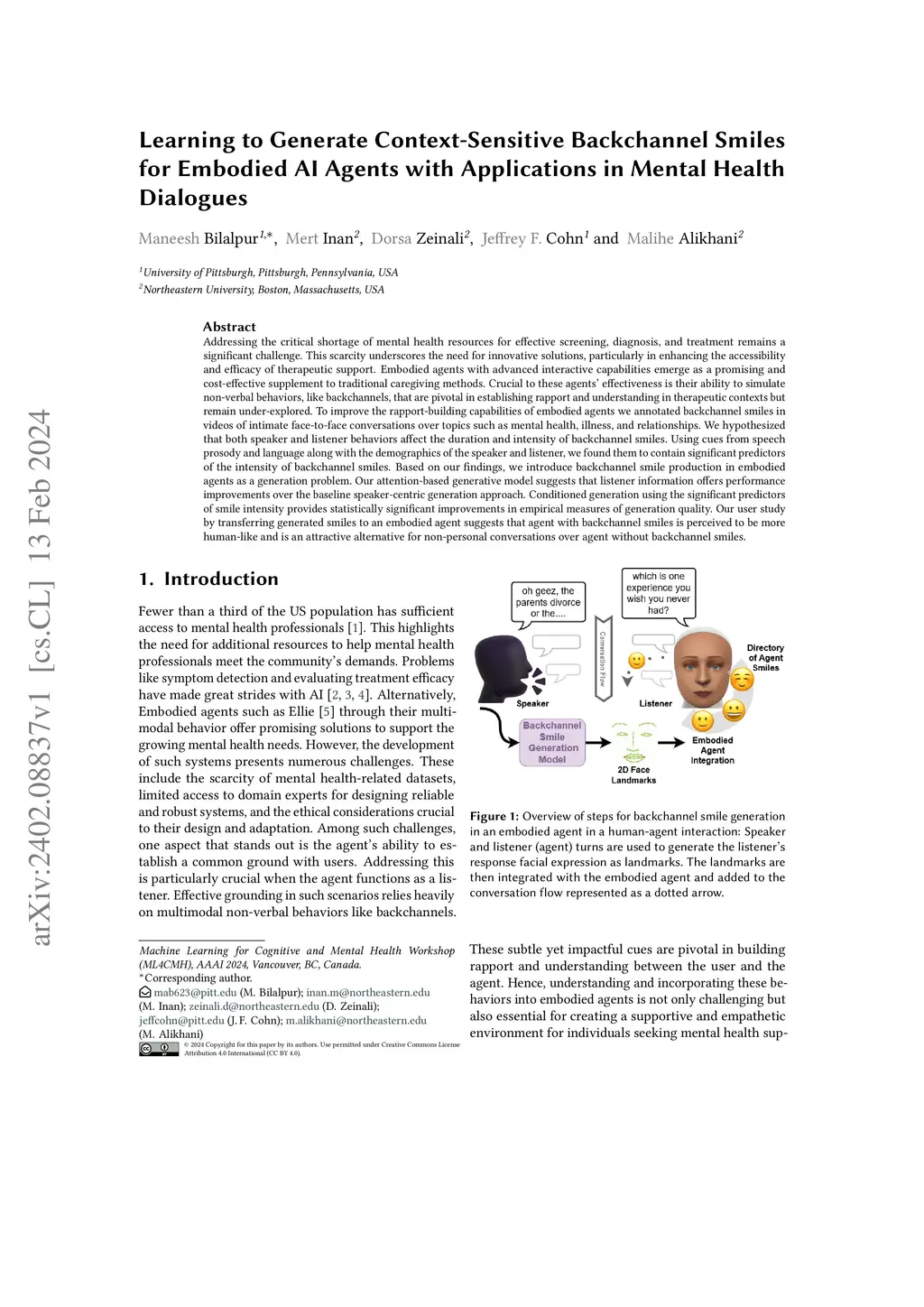 Addressing the critical shortage of mental health resources for effective screening, diagnosis, and treatment remains a significant challenge. This scarcity underscores the need for innovative solutions, particularly in enhancing the accessibility and efficacy of therapeutic support. Embodied agents with advanced interactive capabilities emerge as a promising and cost-effective supplement to traditional caregiving methods. Crucial to these agents' effectiveness is their ability to simulate non-verbal behaviors, like backchannels, that are pivotal in establishing rapport and understanding in therapeutic contexts but remain under-explored. To improve the rapport-building capabilities of embodied agents we annotated backchannel smiles in videos of intimate face-to-face conversations over topics such as mental health, illness, and relationships. We hypothesized that both speaker and listener behaviors affect the duration and intensity of backchannel smiles. Using cues from speech prosody and language along with the demographics of the speaker and listener, we found them to contain significant predictors of the intensity of backchannel smiles. Based on our findings, we introduce backchannel smile production in embodied agents as a generation problem. Our attention-based generative model suggests that listener information offers performance improvements over the baseline speaker-centric generation approach. Conditioned generation using the significant predictors of smile intensity provides statistically significant improvements in empirical measures of generation quality. Our user study by transferring generated smiles to an embodied agent suggests that agent with backchannel smiles is perceived to be more human-like and is an attractive alternative for non-personal conversations over agent without backchannel smiles.