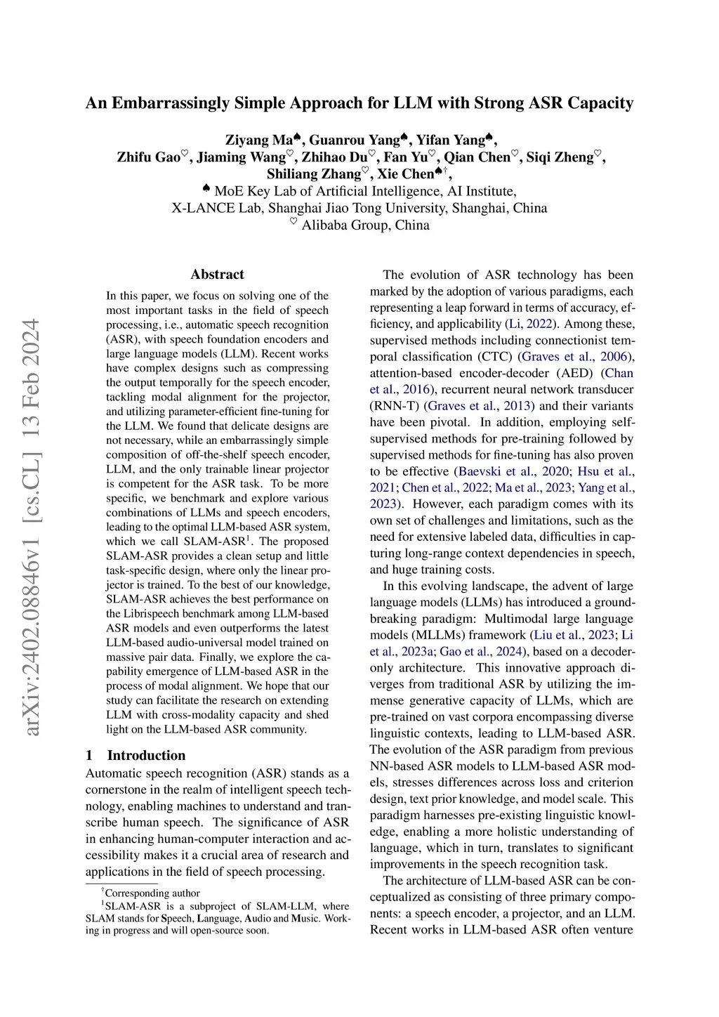 In this paper, we focus on solving one of the most important tasks in the field of speech processing, i.e., automatic speech recognition (ASR), with speech foundation encoders and large language models (LLM). Recent works have complex designs such as compressing the output temporally for the speech encoder, tackling modal alignment for the projector, and utilizing parameter-efficient fine-tuning for the LLM. We found that delicate designs are not necessary, while an embarrassingly simple composition of off-the-shelf speech encoder, LLM, and the only trainable linear projector is competent for the ASR task. To be more specific, we benchmark and explore various combinations of LLMs and speech encoders, leading to the optimal LLM-based ASR system, which we call SLAM-ASR. The proposed SLAM-ASR provides a clean setup and little task-specific design, where only the linear projector is trained. To the best of our knowledge, SLAM-ASR achieves the best performance on the Librispeech benchmark among LLM-based ASR models and even outperforms the latest LLM-based audio-universal model trained on massive pair data. Finally, we explore the capability emergence of LLM-based ASR in the process of modal alignment. We hope that our study can facilitate the research on extending LLM with cross-modality capacity and shed light on the LLM-based ASR community.