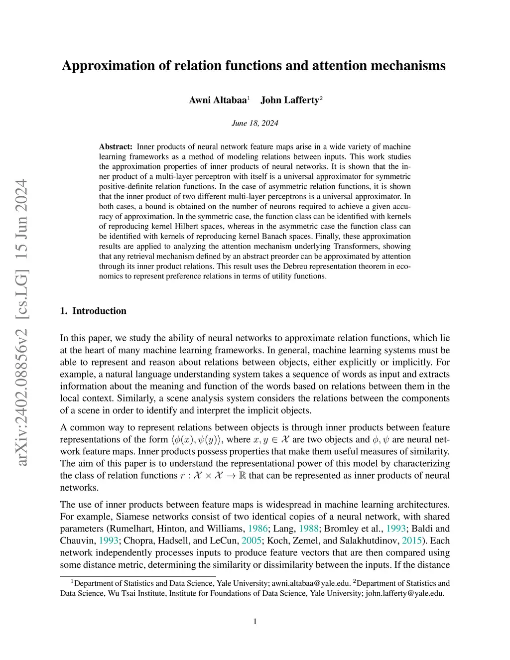 Inner products of neural network feature maps arise in a wide variety of machine learning frameworks as a method of modeling relations between inputs. This work studies the approximation properties of inner products of neural networks. It is shown that the inner product of a multi-layer perceptron with itself is a universal approximator for symmetric positive-definite relation functions. In the case of asymmetric relation functions, it is shown that the inner product of two different multi-layer perceptrons is a universal approximator. In both cases, a bound is obtained on the number of neurons required to achieve a given accuracy of approximation. In the symmetric case, the function class can be identified with kernels of reproducing kernel Hilbert spaces, whereas in the asymmetric case the function class can be identified with kernels of reproducing kernel Banach spaces. Finally, these approximation results are applied to analyzing the attention mechanism underlying Transformers, showing that any retrieval mechanism defined by an abstract preorder can be approximated by attention through its inner product relations. This result uses the Debreu representation theorem in economics to represent preference relations in terms of utility functions.