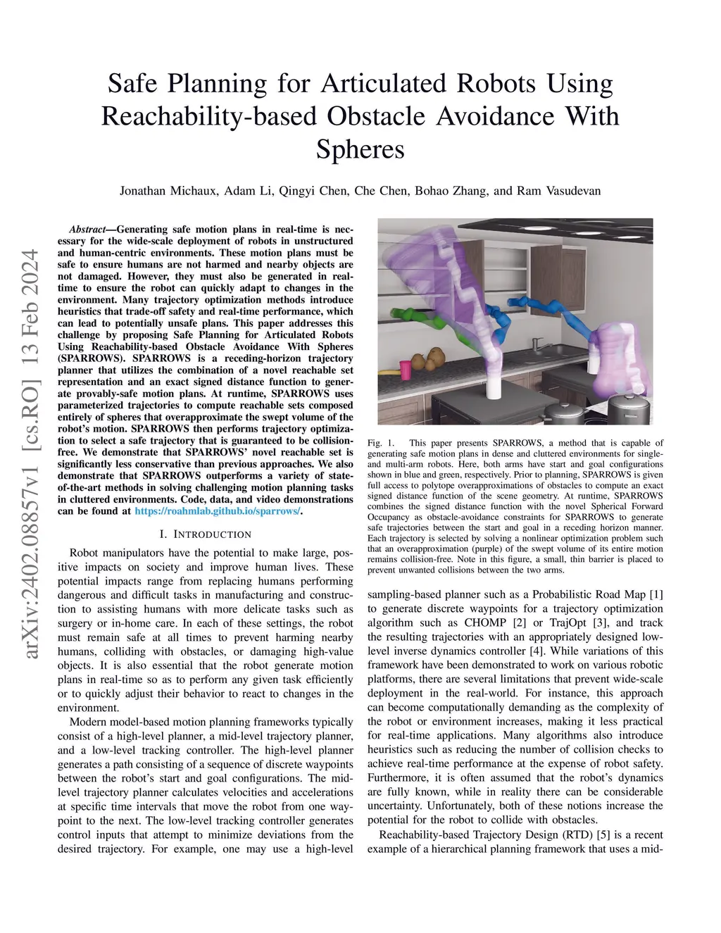 Generating safe motion plans in real-time is necessary for the wide-scale deployment of robots in unstructured and human-centric environments. These motion plans must be safe to ensure humans are not harmed and nearby objects are not damaged. However, they must also be generated in real-time to ensure the robot can quickly adapt to changes in the environment. Many trajectory optimization methods introduce heuristics that trade-off safety and real-time performance, which can lead to potentially unsafe plans. This paper addresses this challenge by proposing Safe Planning for Articulated Robots Using Reachability-based Obstacle Avoidance With Spheres (SPARROWS). SPARROWS is a receding-horizon trajectory planner that utilizes the combination of a novel reachable set representation and an exact signed distance function to generate provably-safe motion plans. At runtime, SPARROWS uses parameterized trajectories to compute reachable sets composed entirely of spheres that overapproximate the swept volume of the robot's motion. SPARROWS then performs trajectory optimization to select a safe trajectory that is guaranteed to be collision-free. We demonstrate that SPARROWS' novel reachable set is significantly less conservative than previous approaches. We also demonstrate that SPARROWS outperforms a variety of state-of-the-art methods in solving challenging motion planning tasks in cluttered environments. Code, data, and video demonstrations can be found at \url{https://roahmlab.github.io/sparrows/}.