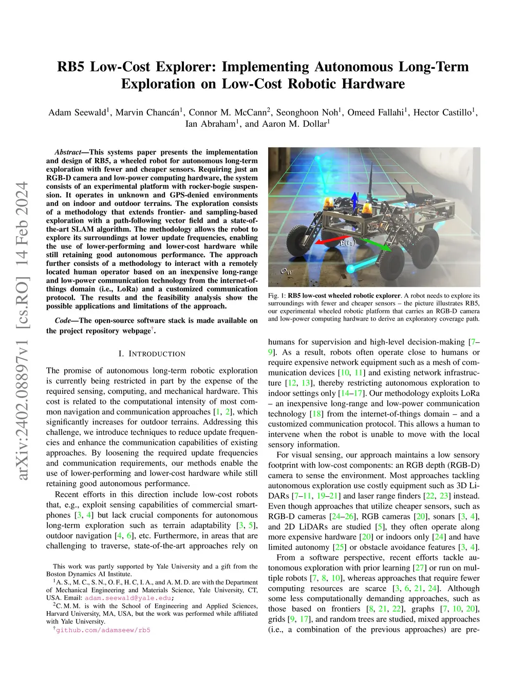 This systems paper presents the implementation and design of RB5, a wheeled robot for autonomous long-term exploration with fewer and cheaper sensors. Requiring just an RGB-D camera and low-power computing hardware, the system consists of an experimental platform with rocker-bogie suspension. It operates in unknown and GPS-denied environments and on indoor and outdoor terrains. The exploration consists of a methodology that extends frontier- and sampling-based exploration with a path-following vector field and a state-of-the-art SLAM algorithm. The methodology allows the robot to explore its surroundings at lower update frequencies, enabling the use of lower-performing and lower-cost hardware while still retaining good autonomous performance. The approach further consists of a methodology to interact with a remotely located human operator based on an inexpensive long-range and low-power communication technology from the internet-of-things domain (i.e., LoRa) and a customized communication protocol. The results and the feasibility analysis show the possible applications and limitations of the approach.