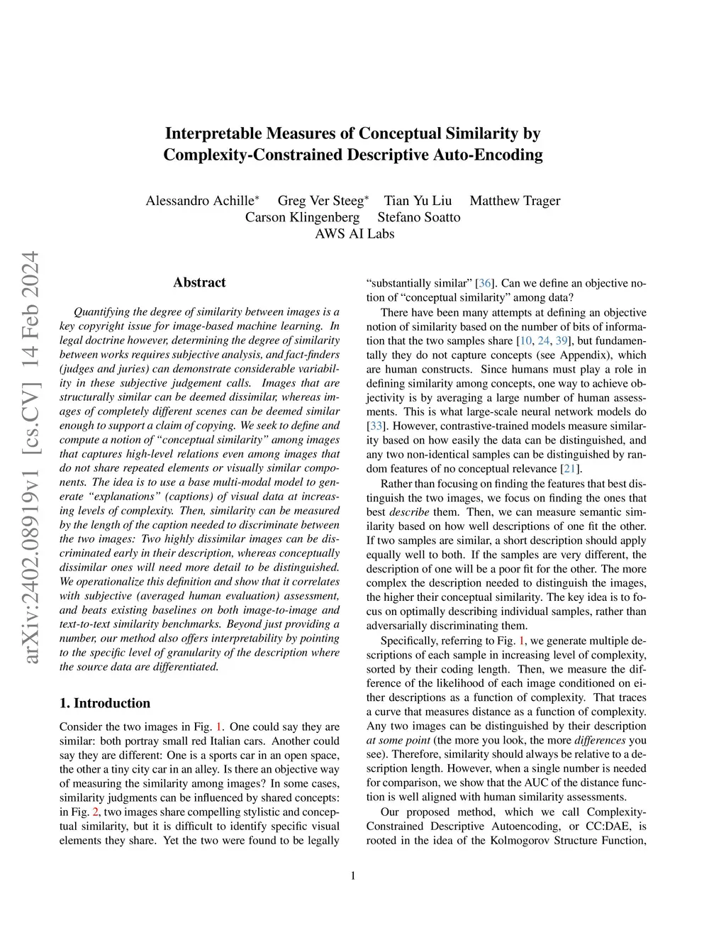 Quantifying the degree of similarity between images is a key copyright issue for image-based machine learning. In legal doctrine however, determining the degree of similarity between works requires subjective analysis, and fact-finders (judges and juries) can demonstrate considerable variability in these subjective judgement calls. Images that are structurally similar can be deemed dissimilar, whereas images of completely different scenes can be deemed similar enough to support a claim of copying. We seek to define and compute a notion of "conceptual similarity" among images that captures high-level relations even among images that do not share repeated elements or visually similar components. The idea is to use a base multi-modal model to generate "explanations" (captions) of visual data at increasing levels of complexity. Then, similarity can be measured by the length of the caption needed to discriminate between the two images: Two highly dissimilar images can be discriminated early in their description, whereas conceptually dissimilar ones will need more detail to be distinguished. We operationalize this definition and show that it correlates with subjective (averaged human evaluation) assessment, and beats existing baselines on both image-to-image and text-to-text similarity benchmarks. Beyond just providing a number, our method also offers interpretability by pointing to the specific level of granularity of the description where the source data are differentiated.