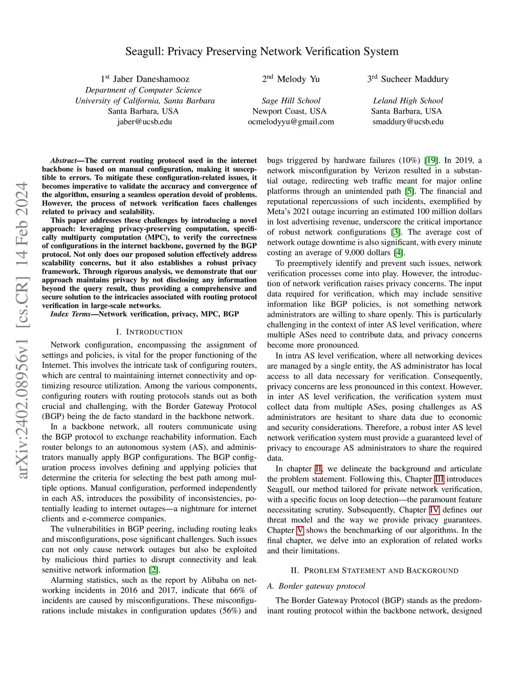 The Internet relies on routing protocols to direct traffic efficiently across interconnected networks, with the Border Gateway Protocol (BGP) serving as the core mechanism managing routing between autonomous systems. However, BGP configurations are largely manual, making them susceptible to human errors that can lead to outages or security vulnerabilities. Verifying the correctness and convergence of BGP configurations is therefore essential for maintaining a stable and secure Internet. Yet, this verification process faces two key challenges: preserving the privacy of proprietary routing information and ensuring scalability across large, distributed networks. This paper introduces a privacy-preserving verification framework that leverages multiparty computation (MPC) to validate BGP configurations without exposing sensitive routing data. Our approach overcomes both privacy and scalability challenges by ensuring that no information beyond the verification outcome is revealed. Through formal analysis, we show that the proposed method achieves strong privacy guarantees and practical scalability, providing a secure and efficient foundation for verifying BGP-based routing in the Internet backbone.