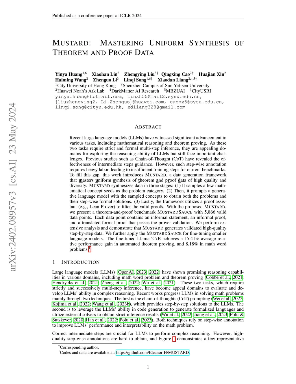Recent large language models (LLMs) have witnessed significant advancement in various tasks, including mathematical reasoning and theorem proving. As these two tasks require strict and formal multi-step inference, they are appealing domains for exploring the reasoning ability of LLMs but still face important challenges. Previous studies such as Chain-of-Thought (CoT) have revealed the effectiveness of intermediate steps guidance. However, such step-wise annotation requires heavy labor, leading to insufficient training steps for current benchmarks. To fill this gap, this work introduces MUSTARD, a data generation framework that masters uniform synthesis of theorem and proof data of high quality and diversity. MUSTARD synthesizes data in three stages: (1) It samples a few mathematical concept seeds as the problem category. (2) Then, it prompts a generative language model with the sampled concepts to obtain both the problems and their step-wise formal solutions. (3) Lastly, the framework utilizes a proof assistant (e.g., Lean Prover) to filter the valid proofs. With the proposed MUSTARD, we present a theorem-and-proof benchmark MUSTARDSAUCE with 5,866 valid data points. Each data point contains an informal statement, an informal proof, and a translated formal proof that passes the prover validation. We perform extensive analysis and demonstrate that MUSTARD generates validated high-quality step-by-step data. We further apply the MUSTARDSAUCE for fine-tuning smaller language models. The fine-tuned Llama 2-7B achieves a 15.41% average relative performance gain in automated theorem proving, and 8.18% in math word problems. Codes and data are available at https://github.com/Eleanor-H/MUSTARD.