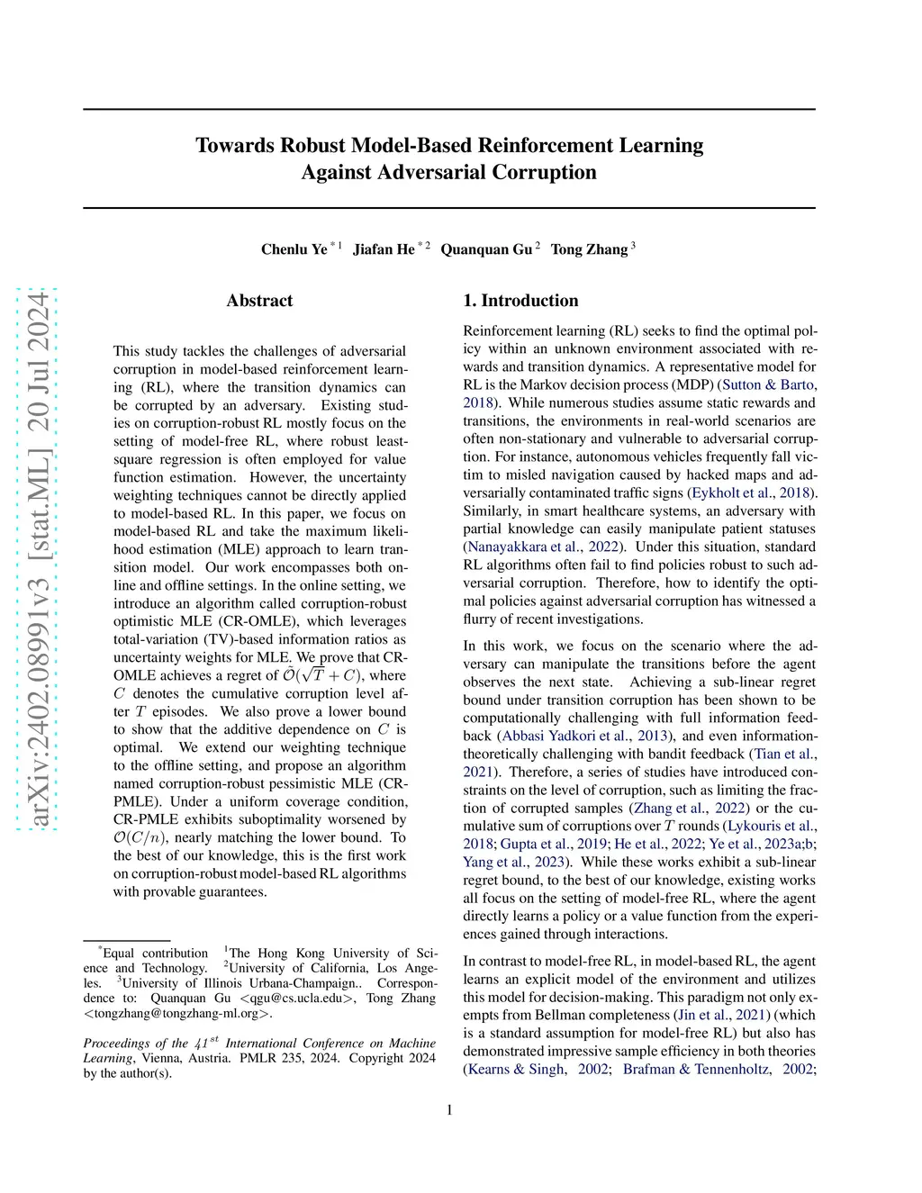 This study tackles the challenges of adversarial corruption in model-based reinforcement learning (RL), where the transition dynamics can be corrupted by an adversary. Existing studies on corruption-robust RL mostly focus on the setting of model-free RL, where robust least-square regression is often employed for value function estimation. However, these techniques cannot be directly applied to model-based RL. In this paper, we focus on model-based RL and take the maximum likelihood estimation (MLE) approach to learn transition model. Our work encompasses both online and offline settings. In the online setting, we introduce an algorithm called corruption-robust optimistic MLE (CR-OMLE), which leverages total-variation (TV)-based information ratios as uncertainty weights for MLE. We prove that CR-OMLE achieves a regret of , where denotes the cumulative corruption level after episodes. We also prove a lower bound to show that the additive dependence on is optimal. We extend our weighting technique to the offline setting, and propose an algorithm named corruption-robust pessimistic MLE (CR-PMLE). Under a uniform coverage condition, CR-PMLE exhibits suboptimality worsened by , nearly matching the lower bound. To the best of our knowledge, this is the first work on corruption-robust model-based RL algorithms with provable guarantees.