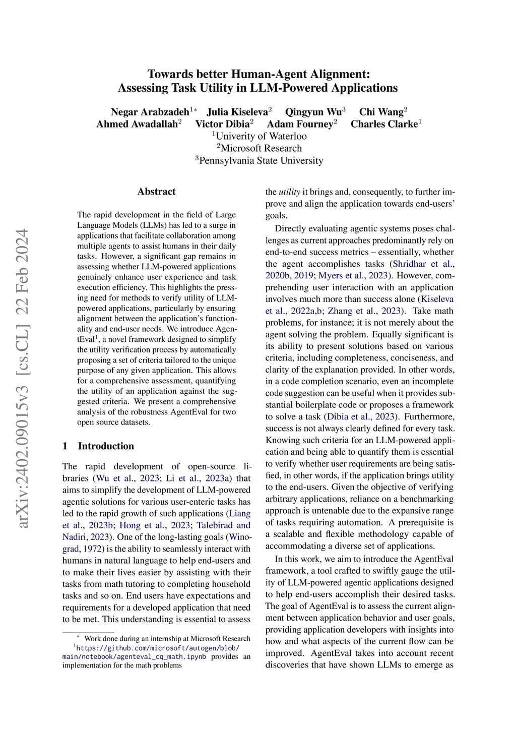The rapid development in the field of Large Language Models (LLMs) has led to a surge in applications that facilitate collaboration among multiple agents to assist humans in their daily tasks. However, a significant gap remains in assessing whether LLM-powered applications genuinely enhance user experience and task execution efficiency. This highlights the pressing need for methods to verify utility of LLM-powered applications, particularly by ensuring alignment between the application's functionality and end-user needs. We introduce AgentEval provides an implementation for the math problems, a novel framework designed to simplify the utility verification process by automatically proposing a set of criteria tailored to the unique purpose of any given application. This allows for a comprehensive assessment, quantifying the utility of an application against the suggested criteria. We present a comprehensive analysis of the robustness of quantifier's work.