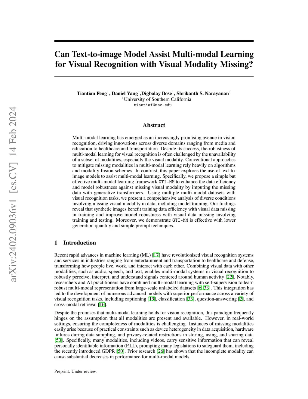 Multi-modal learning has emerged as an increasingly promising avenue in vision recognition, driving innovations across diverse domains ranging from media and education to healthcare and transportation. Despite its success, the robustness of multi-modal learning for visual recognition is often challenged by the unavailability of a subset of modalities, especially the visual modality. Conventional approaches to mitigate missing modalities in multi-modal learning rely heavily on algorithms and modality fusion schemes. In contrast, this paper explores the use of text-to-image models to assist multi-modal learning. Specifically, we propose a simple but effective multi-modal learning framework GTI-MM to enhance the data efficiency and model robustness against missing visual modality by imputing the missing data with generative transformers. Using multiple multi-modal datasets with visual recognition tasks, we present a comprehensive analysis of diverse conditions involving missing visual modality in data, including model training. Our findings reveal that synthetic images benefit training data efficiency with visual data missing in training and improve model robustness with visual data missing involving training and testing. Moreover, we demonstrate GTI-MM is effective with lower generation quantity and simple prompt techniques.